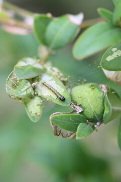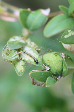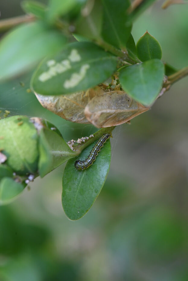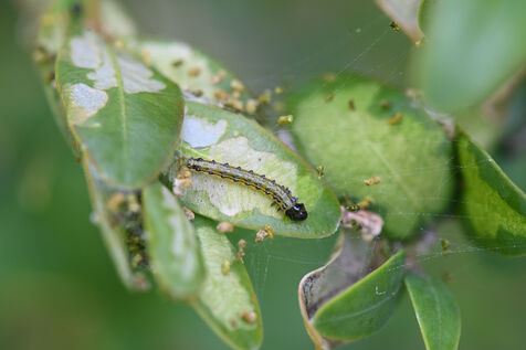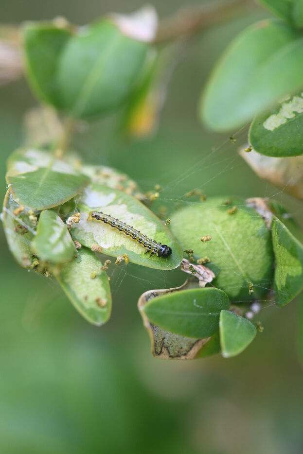 Coming from the Far East and unfortunately exported to France, the box tree pyralid or Cydalima perspectalis is a species of moth that damages box trees when it is in the caterpillar stage. In February-March, the overwintering caterpillars wake up and attack the box tree leaves to feed, causing a lot of damage until they reach their pupation stage. The caterpillars feed exclusively on box trees (Buxus), consuming the leaves and bark.