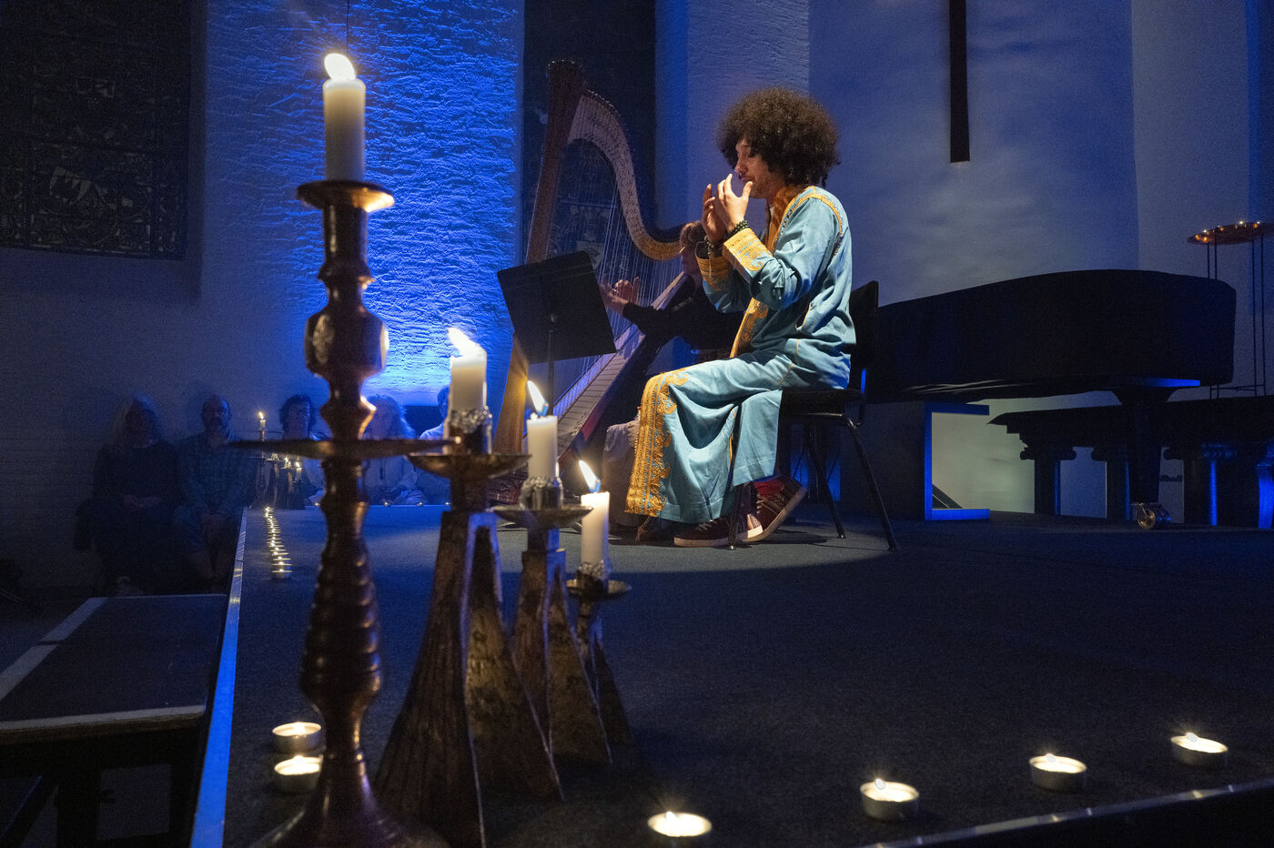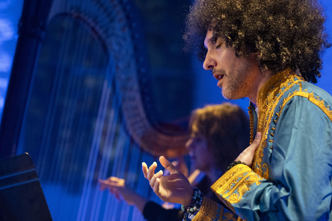 Walid Ben Selim, in duet with Marie-Marguerite Cano (harp), sings Here and Now in Arabic at the Protestant church as part of the Cully Jazz Festival 2024. This recital of ancient Sufi poetry is an act of love, a bridge between cultures and religions. Born in Casablanca, Morocco, Walid Ben Selim describes himself as a humanist singer and composer in multiple forms, in love with poetry to which he dedicates his artistic career.