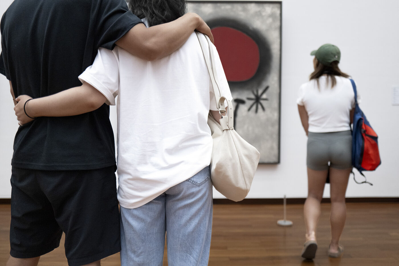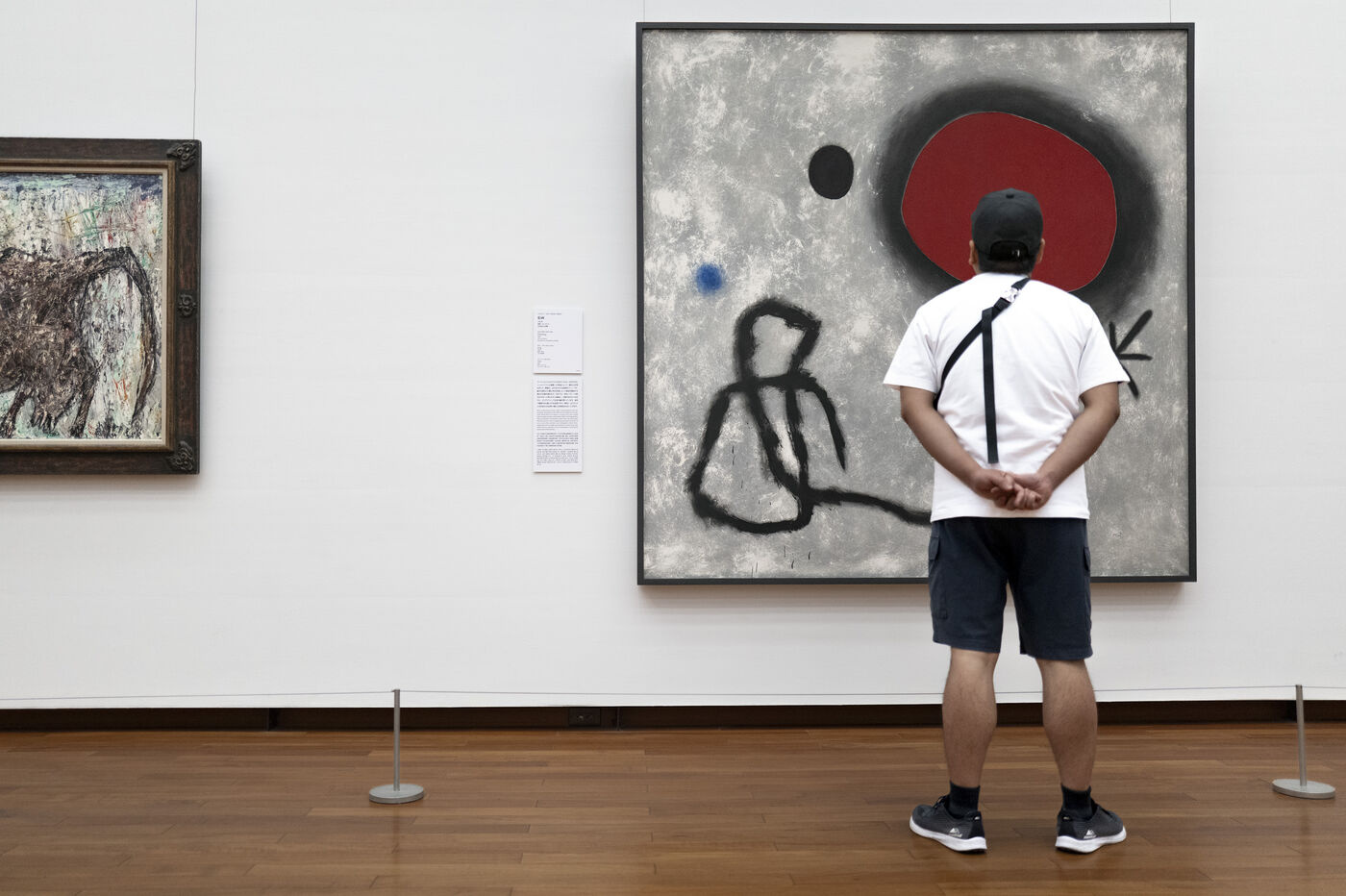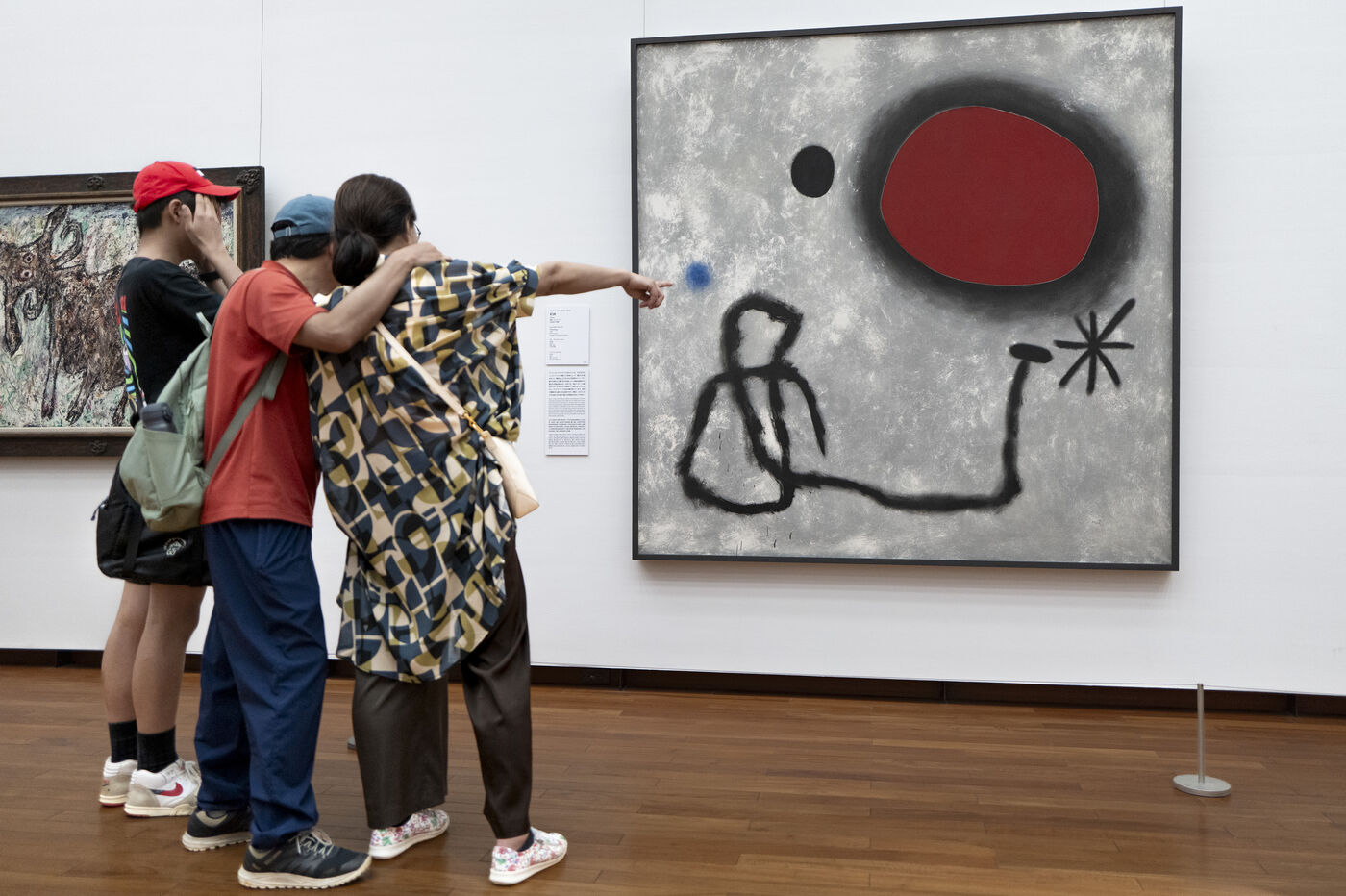 Joan Miró, Peinture 1953, Musée national d’art occidental à Tokyo, Japon, le 19 septembre 2024. Ce musée, réalisé en 1959 par l’architecte franco-suisse Le Corbusier et agrandi depuis, héberge une puissante toile de Joan Miró. Son disque rouge renvoie le visiteur à la symbolique du soleil levant, emblème du drapeau national japonais.