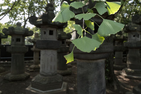 Cemeteries in Japan are often located near residential areas or temples. The repetitive geometry of the alignments of cut stone steles, sometimes in the shape of a lantern, is reminiscent of the geometry of the city in the background.