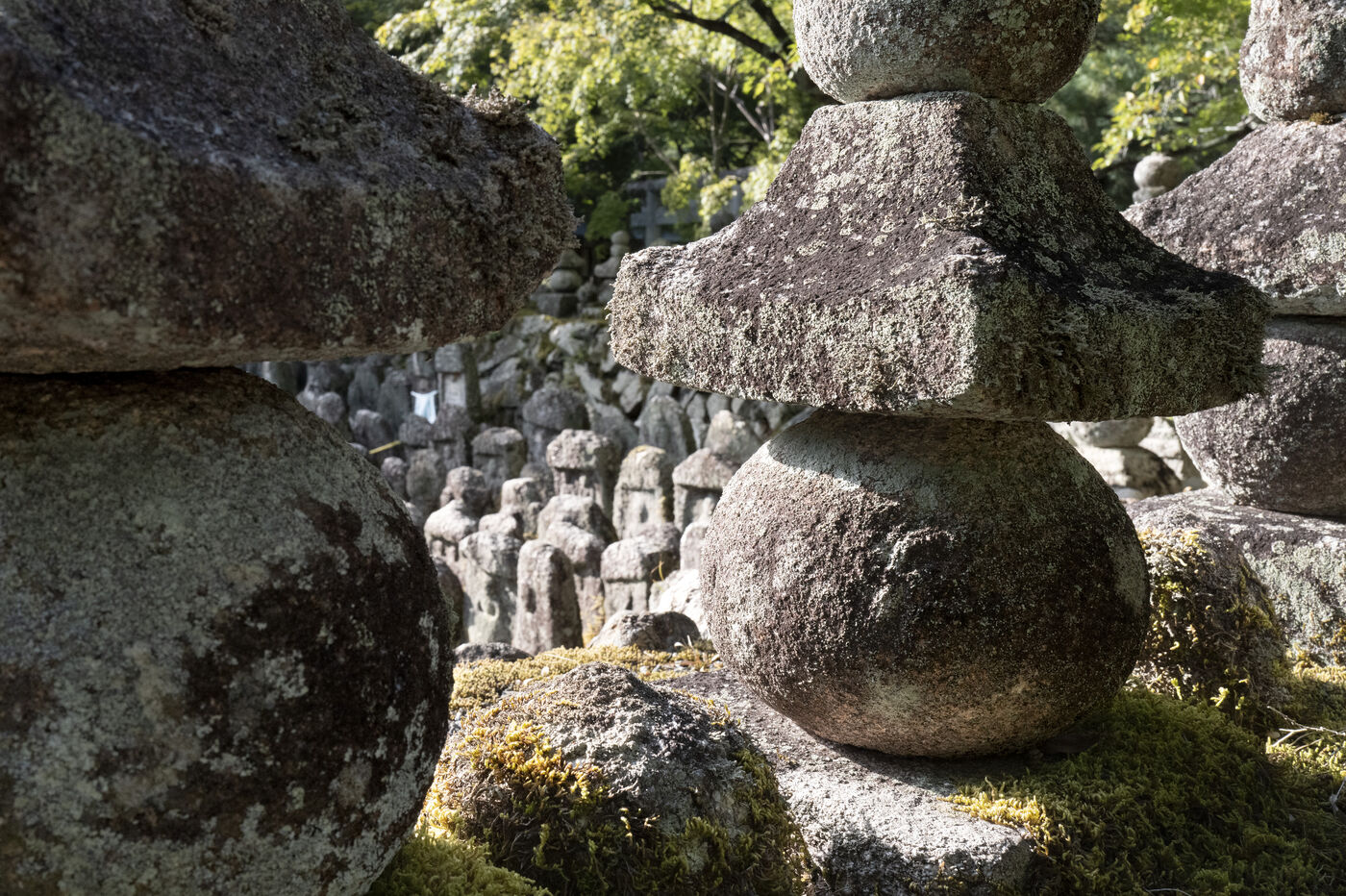 Les cimetières au Japon sont souvent proches des quartiers d’habitation ou des temples. La géométrie répétitive des alignements de stèles en pierres taillées superposées, parfois en forme de lanterne, rappellent la géométrie de la ville en arrière-plan.