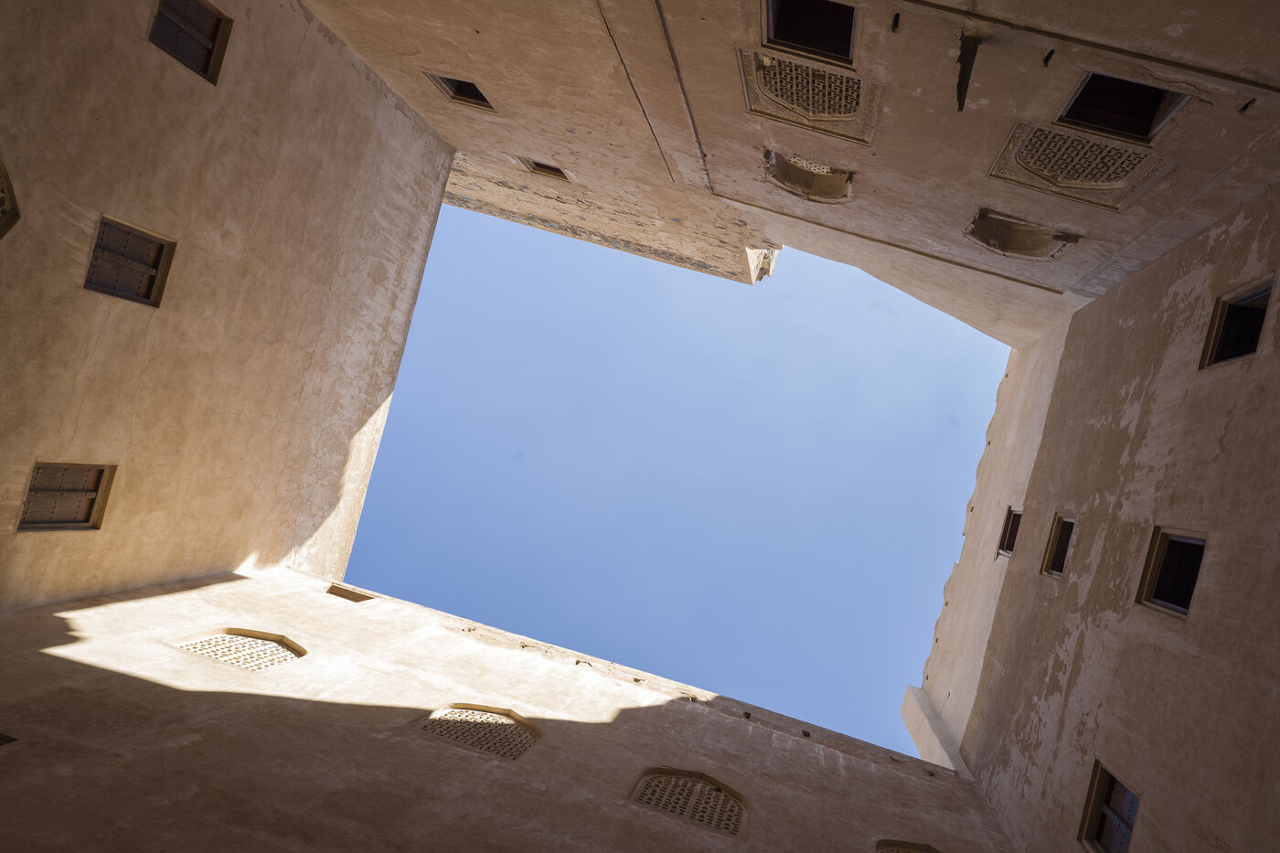 Classés au Patrimoine mondial de l’Unesco, les forteresses et villages historiques du sultanat d’Oman ont été construits en terre avec quelques éléments de support en bois. Les escaliers, niches, ouvertures et passage secrets sont intégrées dans l’épaisseur de la construction monolithique.