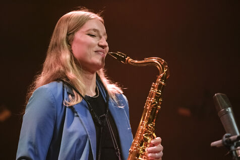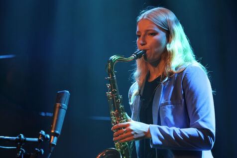 La saxophoniste anglaise Emma Rawicz en concert au JazzOnze+ Festival 2025, avec son 4tet Chroma comprenant Elliot Galvin (pno), Kevin Glasgow (bass) et Asaf Sirkis (drms).