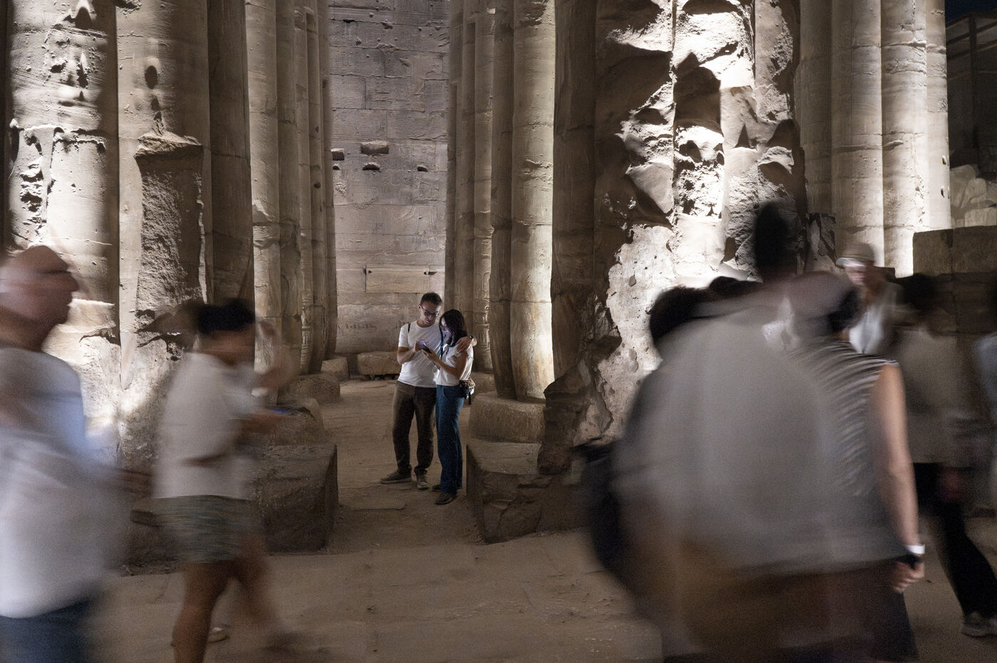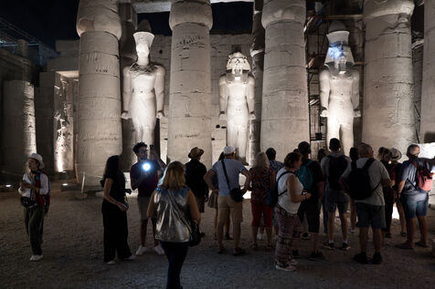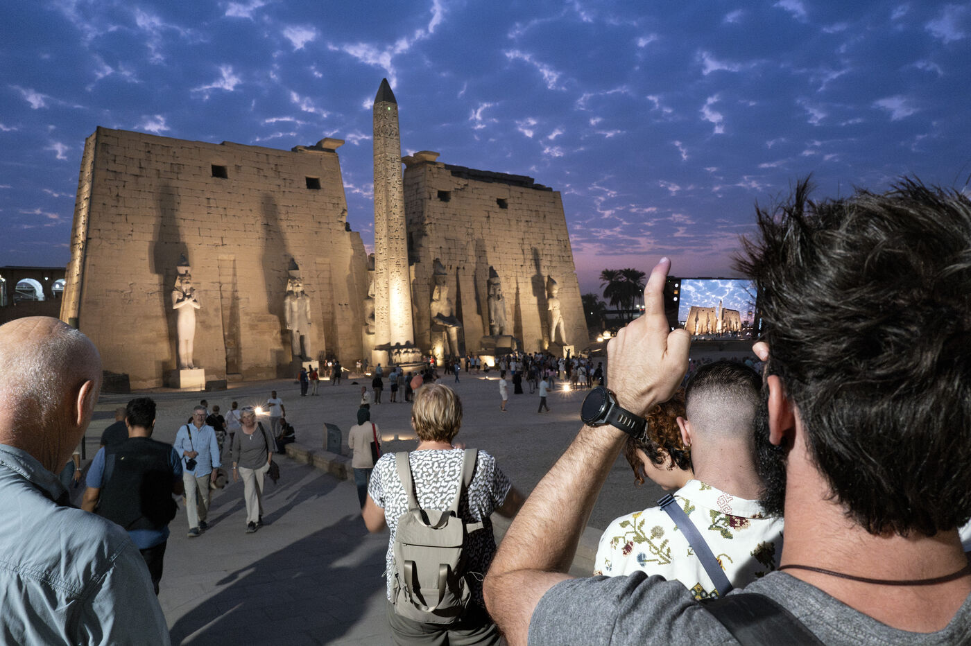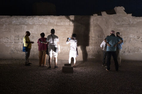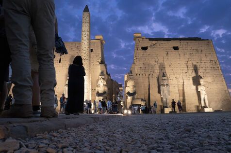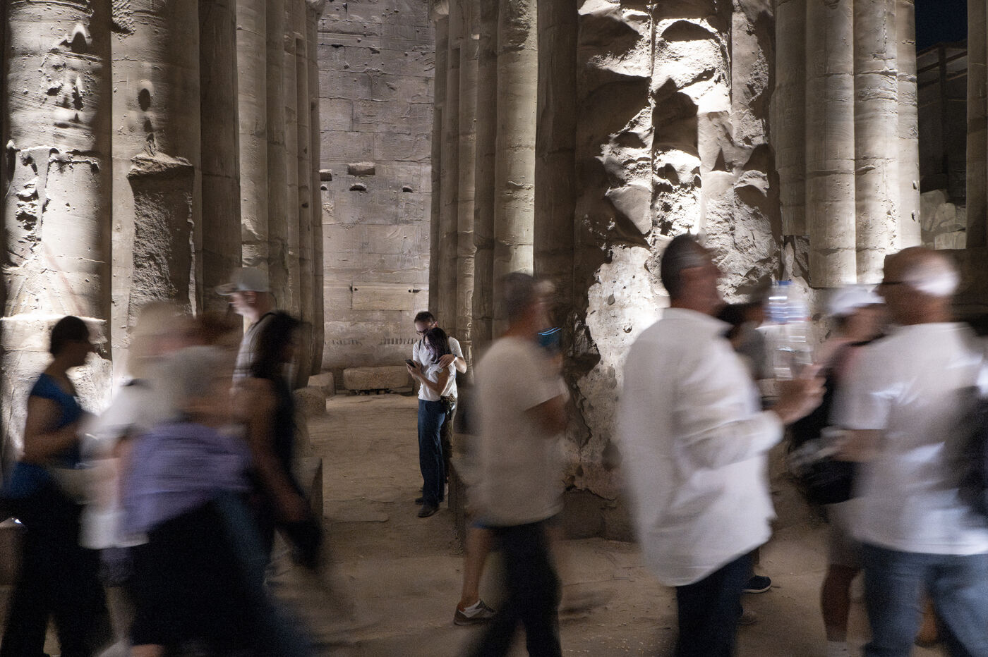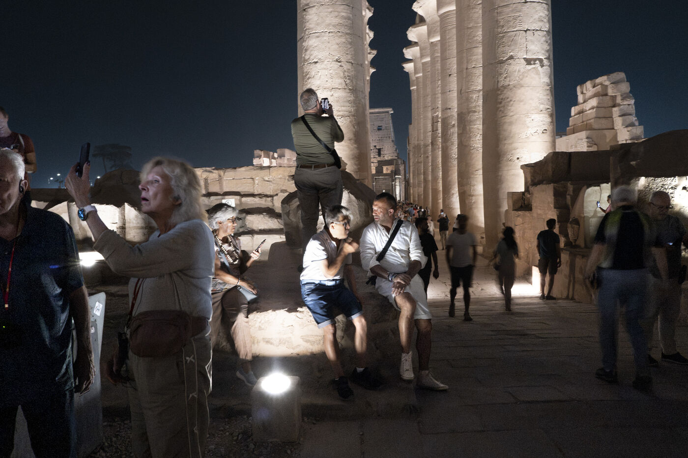 Saturday night fever after sunset at the Temple of Amun in Luxor. Compact groups of tourists stream into the temple, following their guide and snapping selfies.