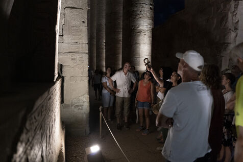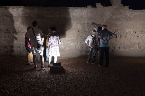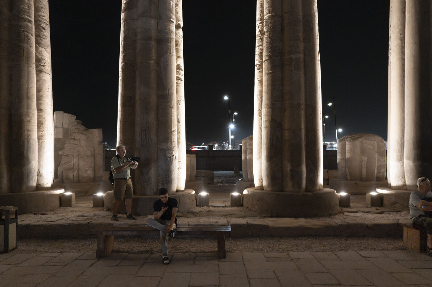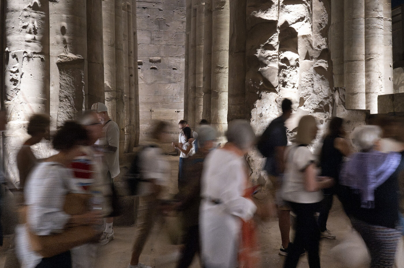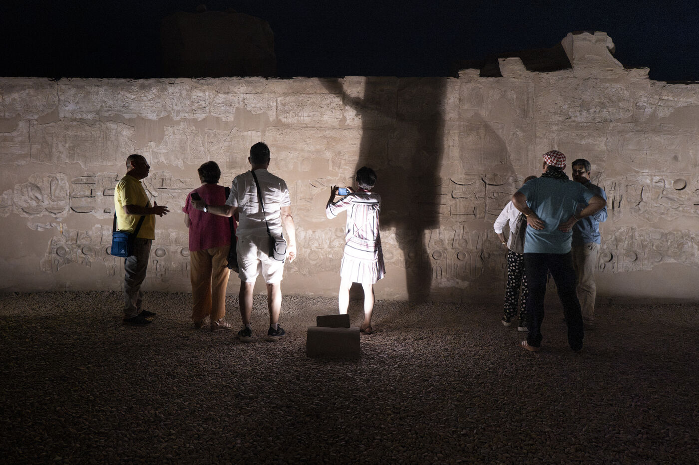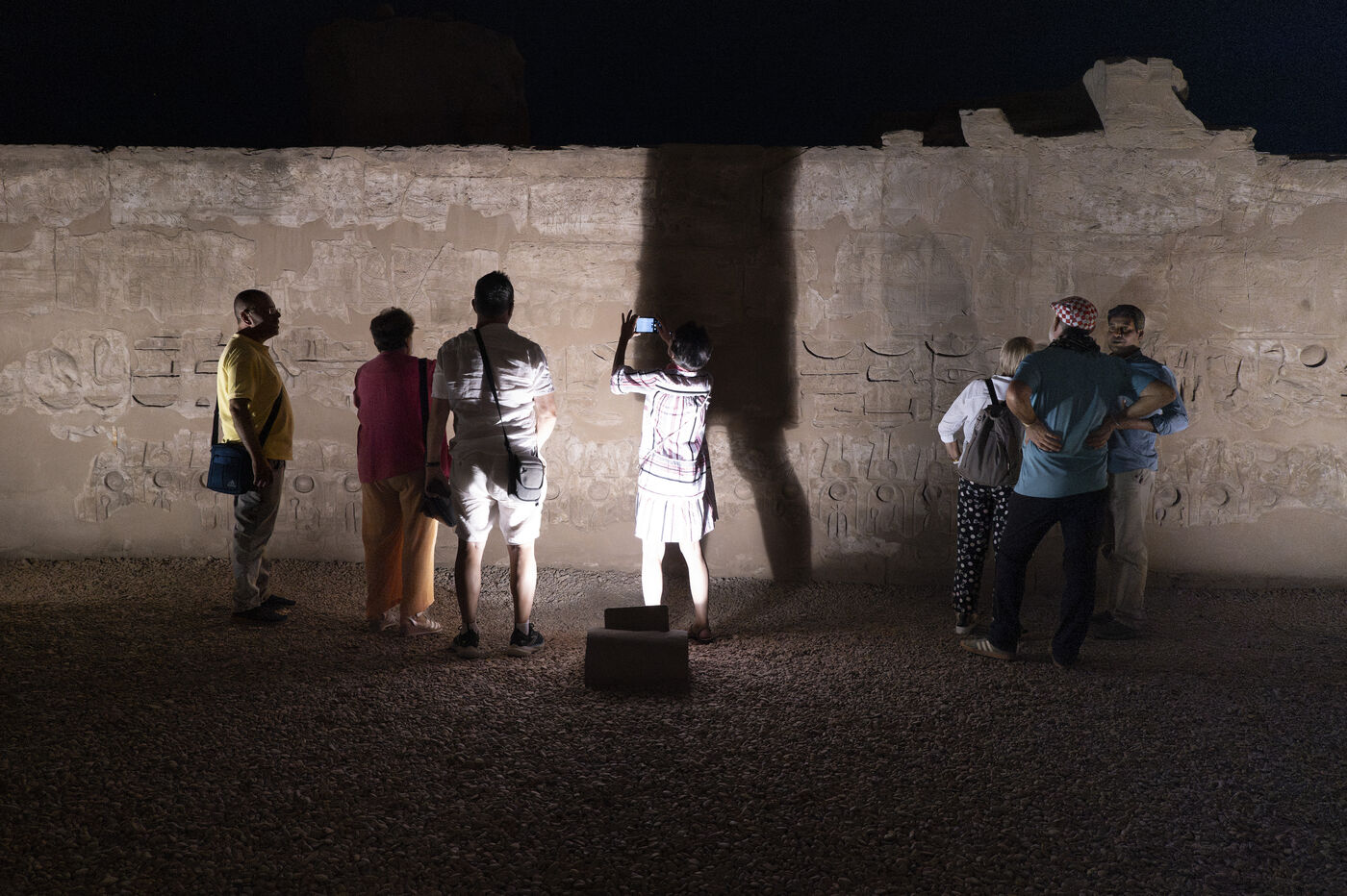 Saturday night fever after sunset at the Temple of Amun in Luxor. Compact groups of tourists stream into the temple, following their guide and snapping selfies.