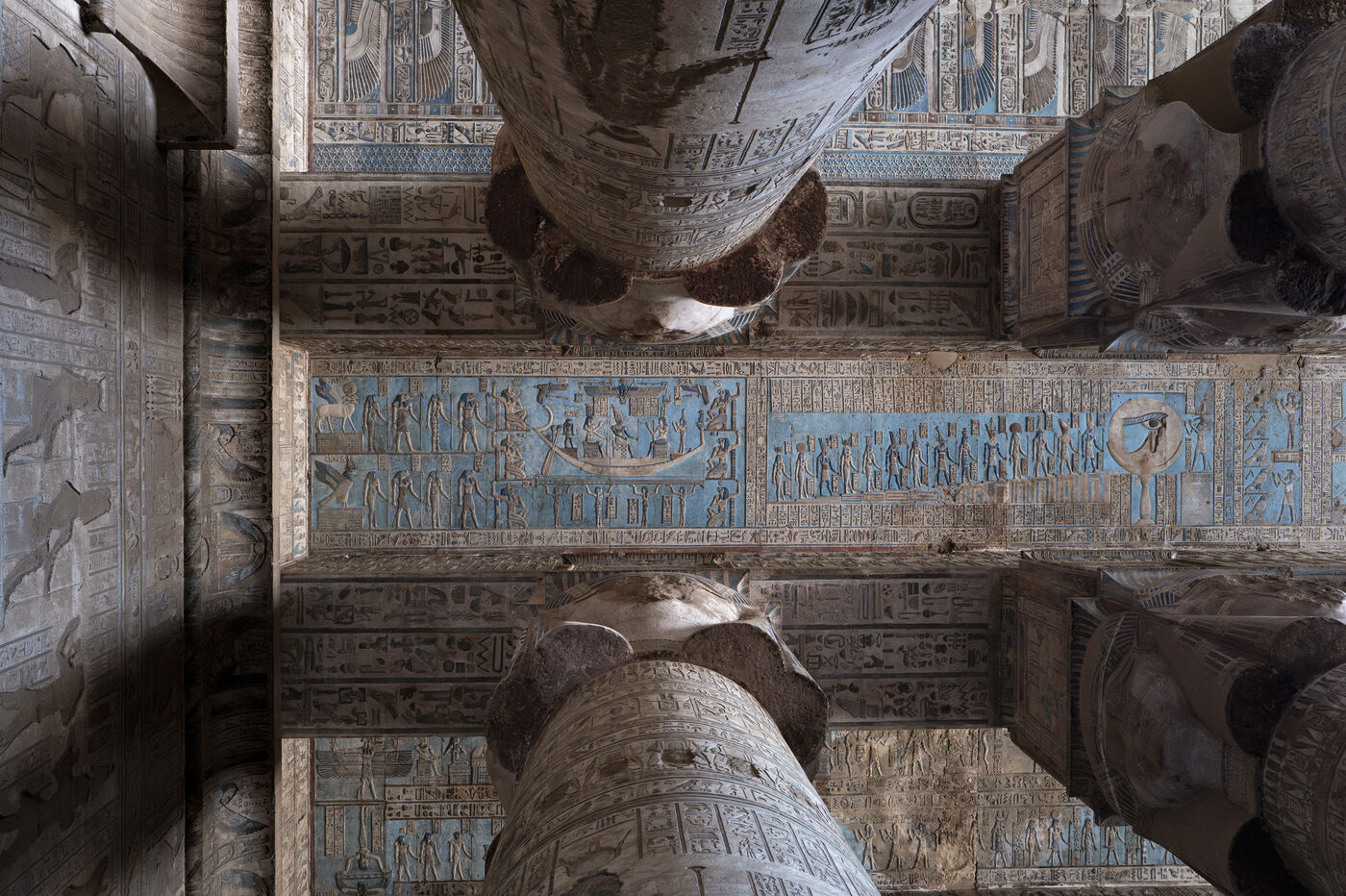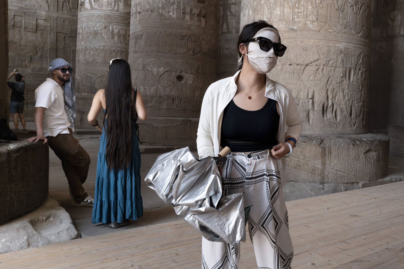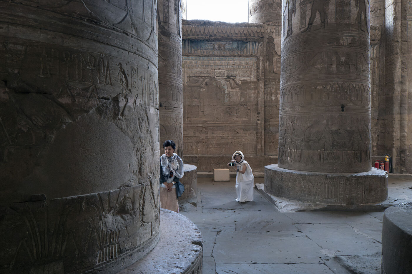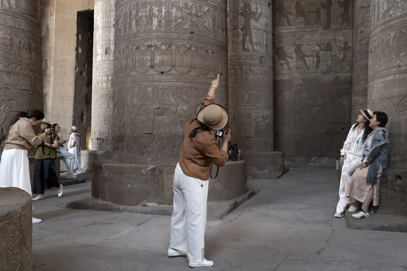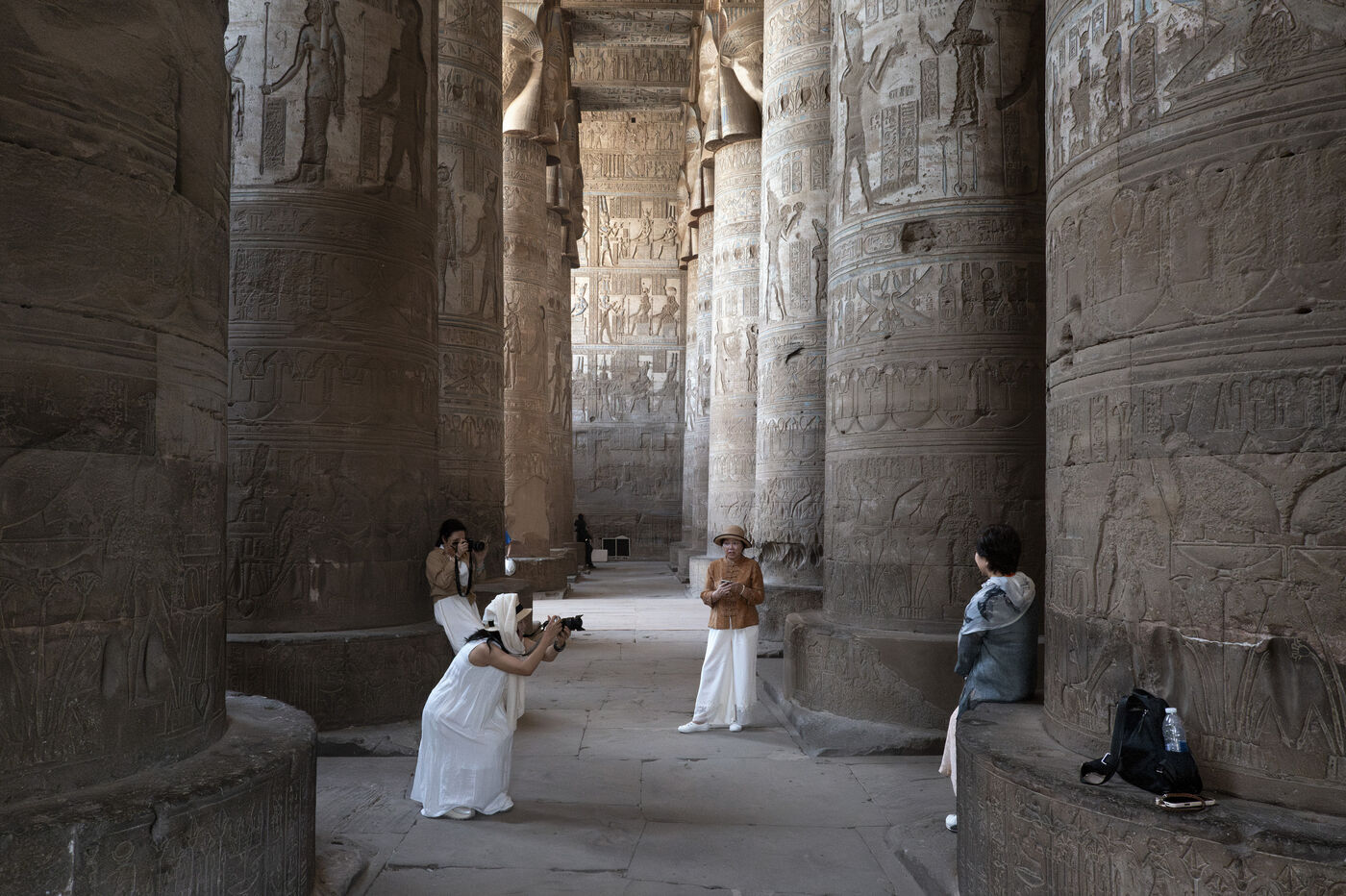 Les touristes suivent leur guide et se prennent en selfie dans le temple d’Hathor, déesse de l’amour et de la beauté, à Denderah.