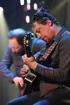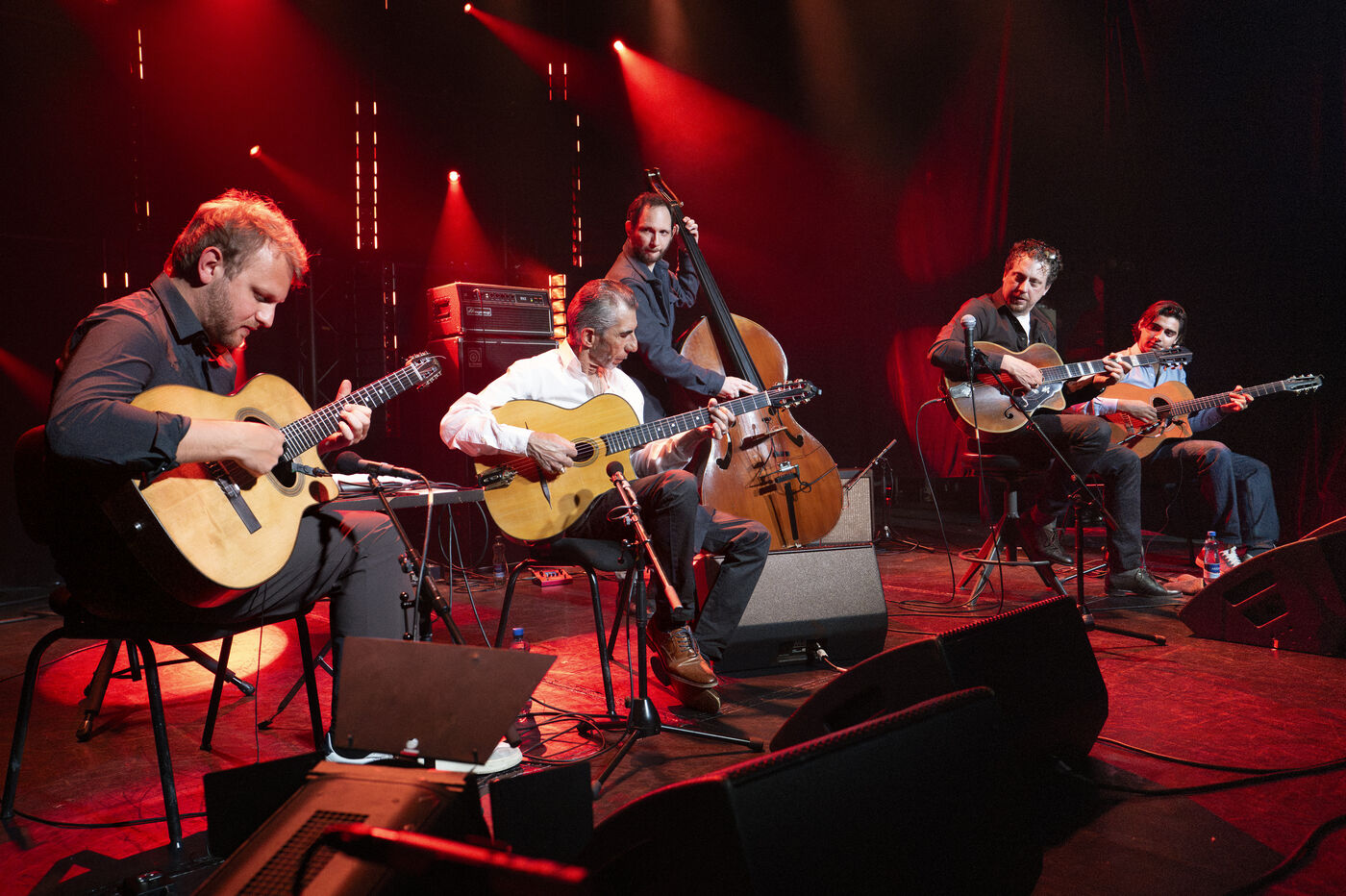 Génération Django at the Montreux Guitar Show MIGS 2026: gypsy jazz revisited by a double trio, featuring guitarists Angelo Debarre and Adrien Moignard, Fanou Torracinta and Hugo Guezbar, supported by bassist William Brunard.