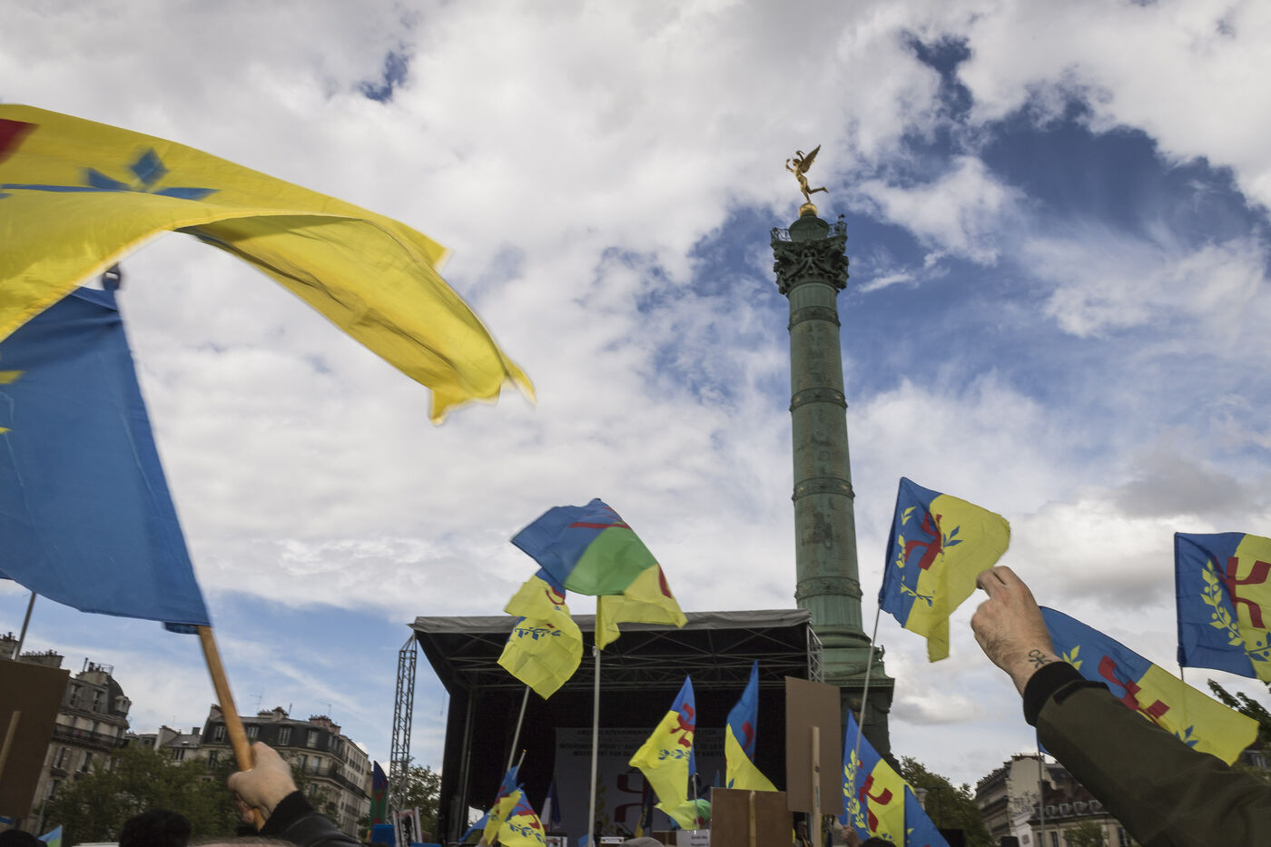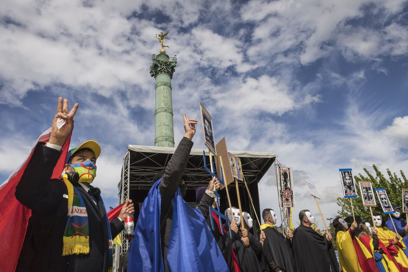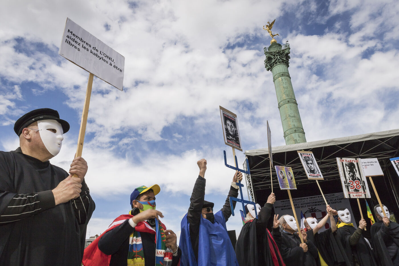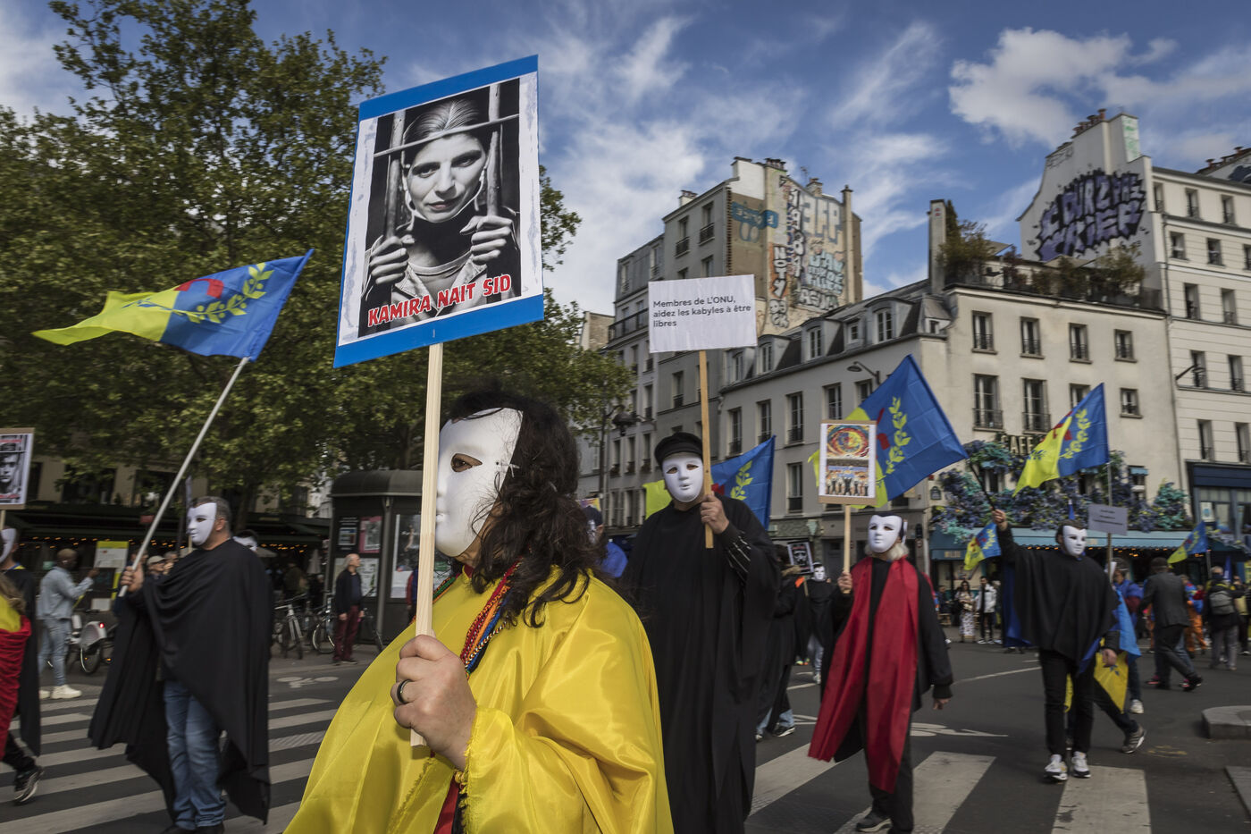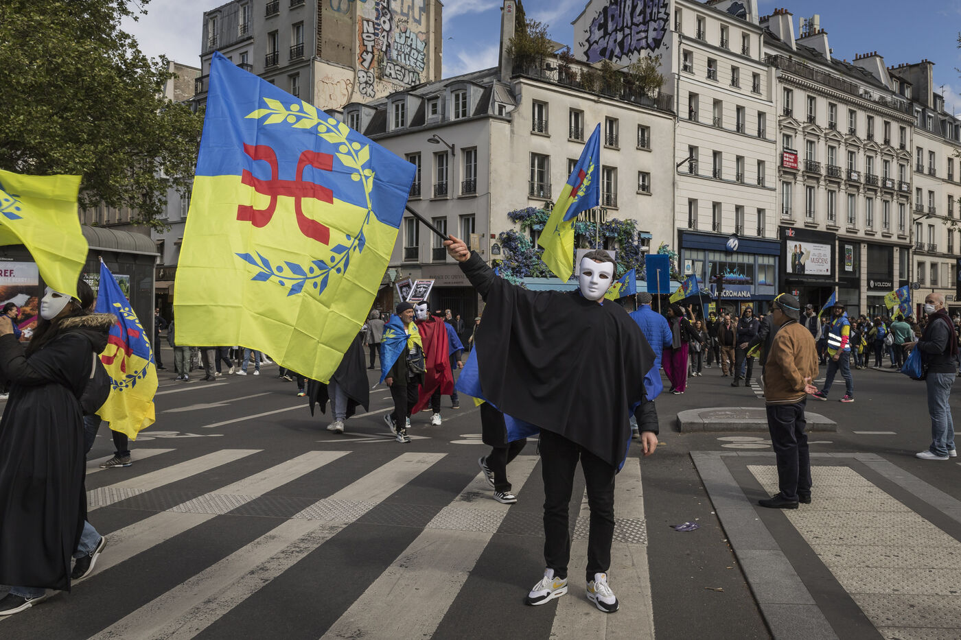 France, Paris, 2025-04-20. Following an appeal by the Kabyle Government in Exile (Anavad) to all its supporters, a peaceful march in favor of Kabylian independence brought together hundreds of demonstrators between Place de la Nation and Place de Bastille. Photograph by Pascal SONNET / Hans Lucas.