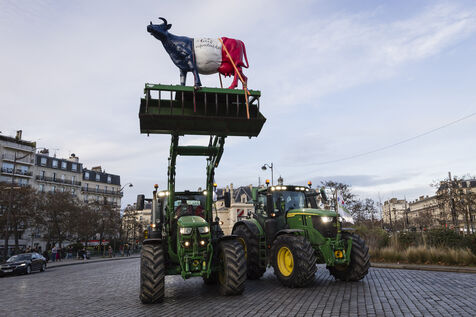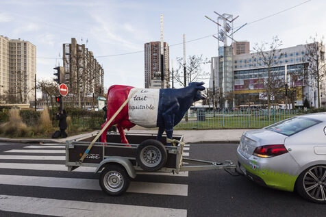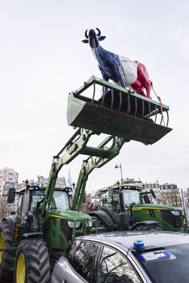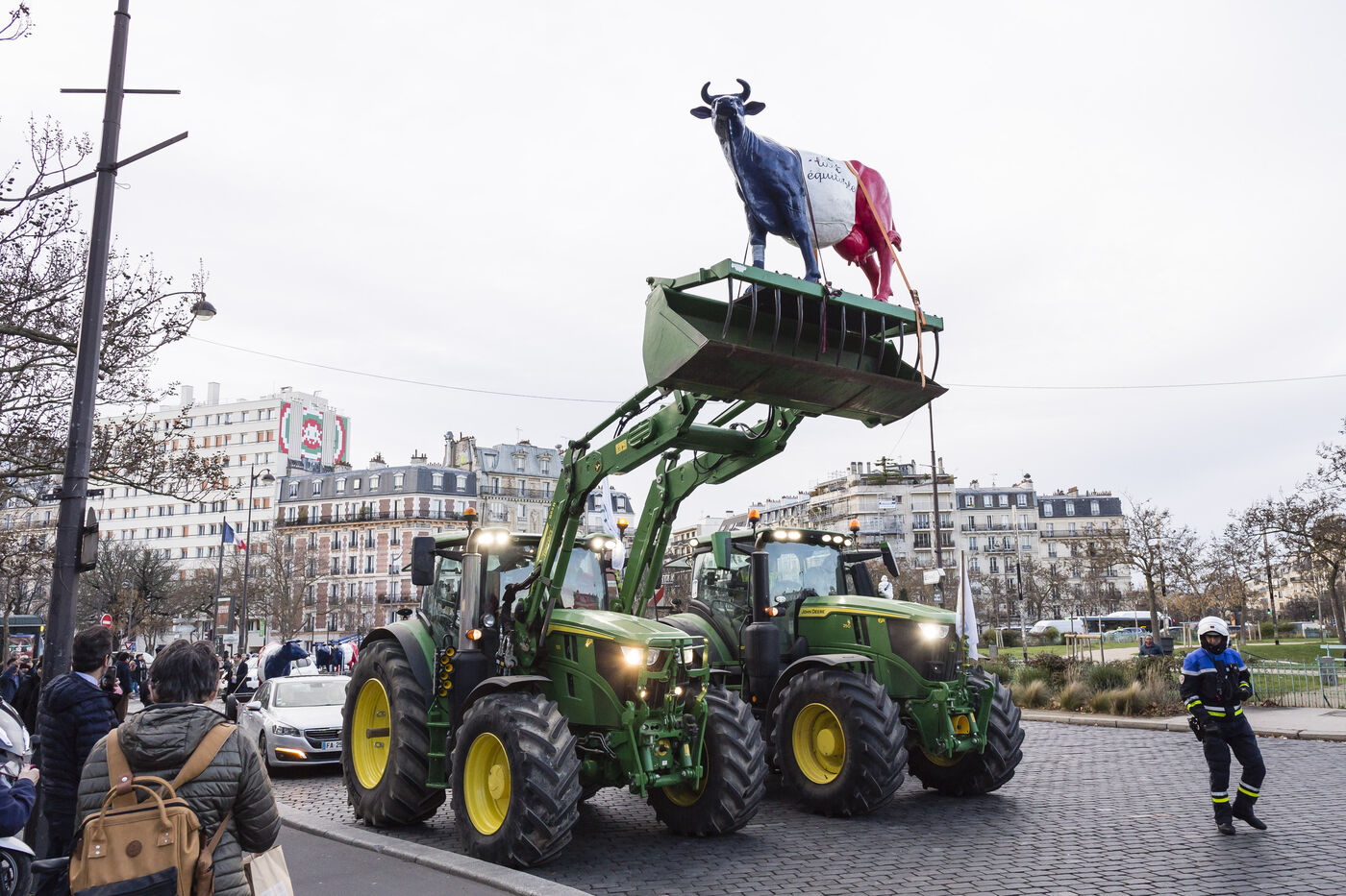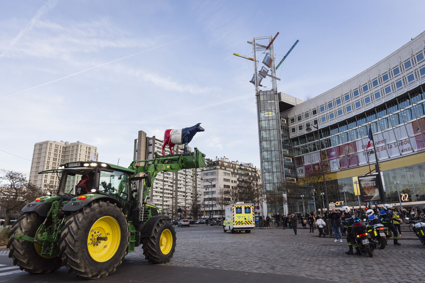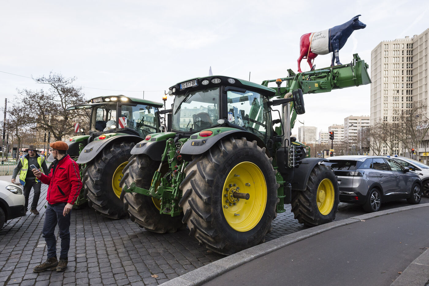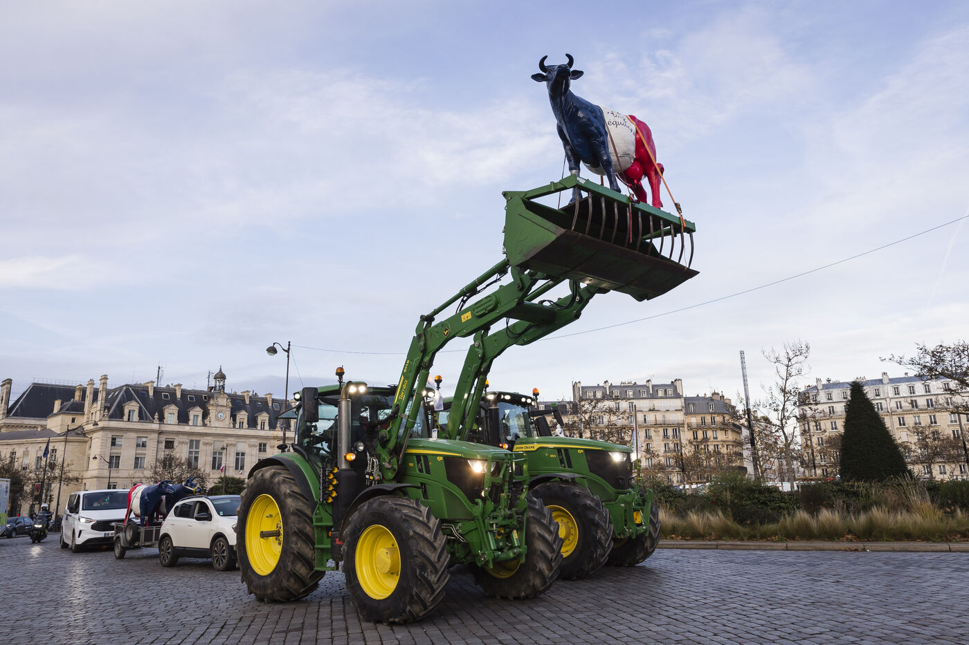 France, Paris, January 15, 2026. Tractors and tricolor cows, representatives of the dairy industry, on Place d Italie. Photo by Pascal SONNET / Hans Lucas.