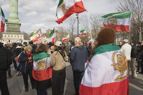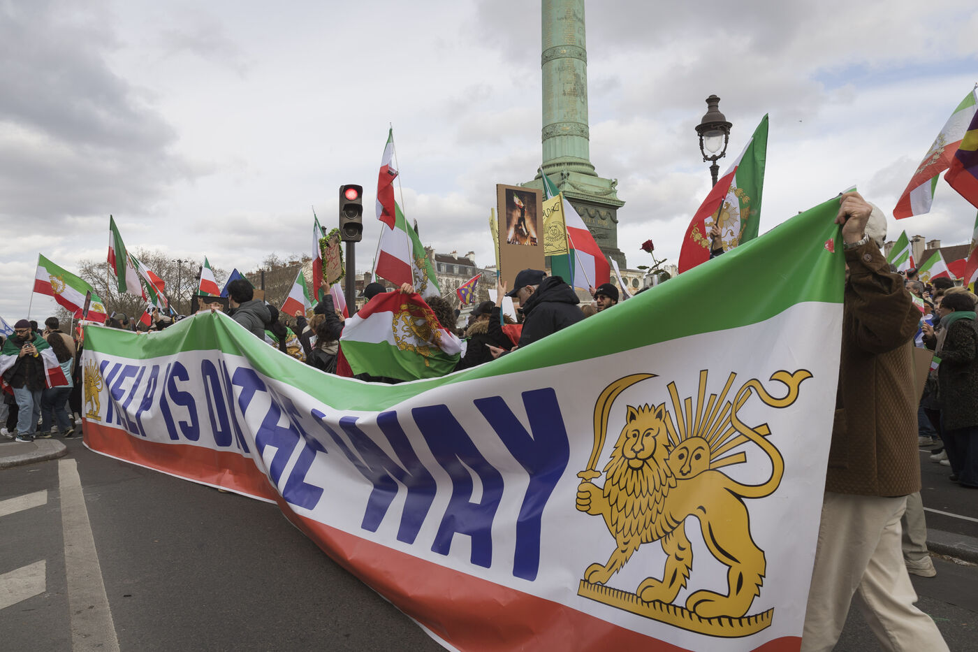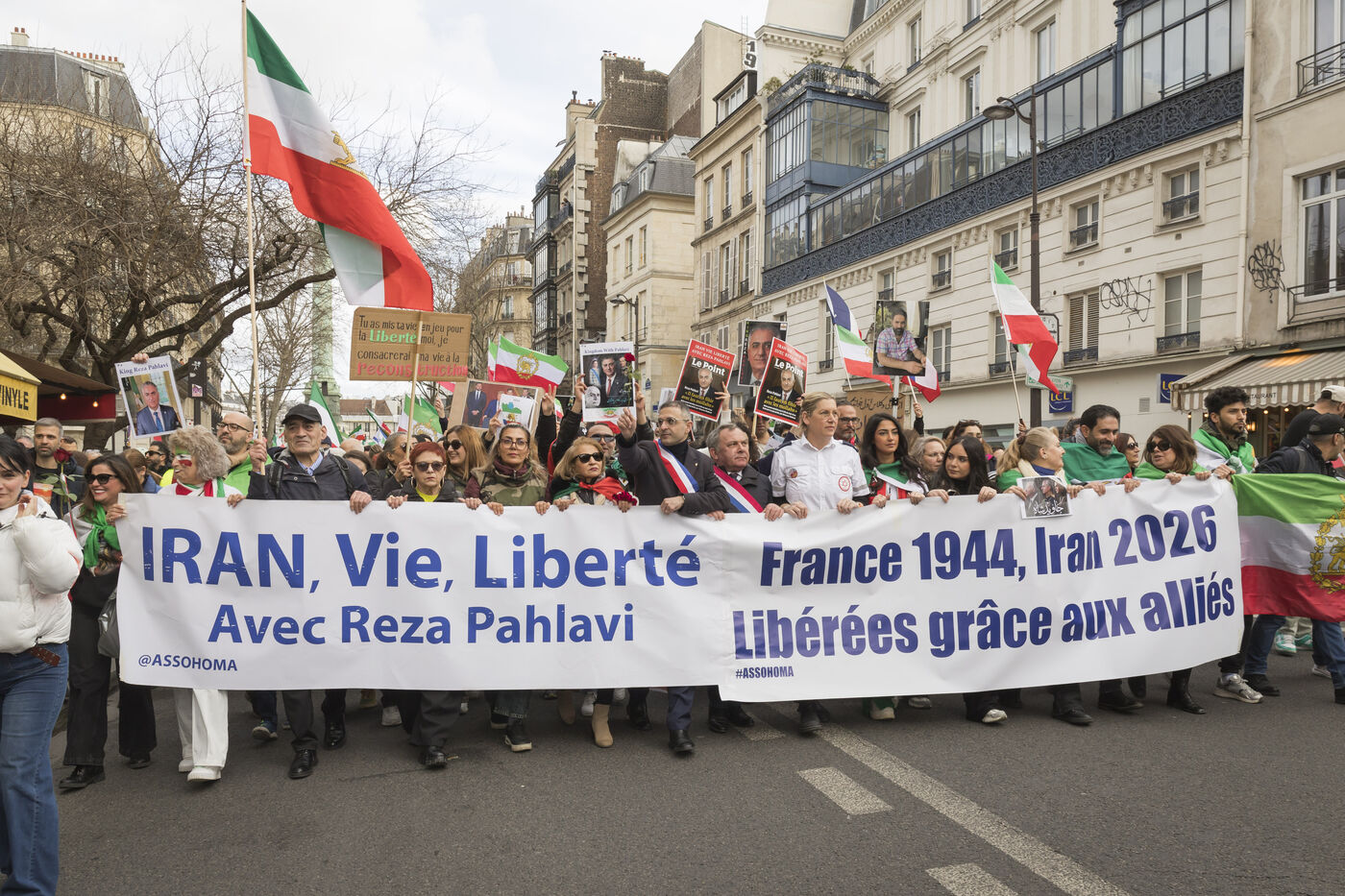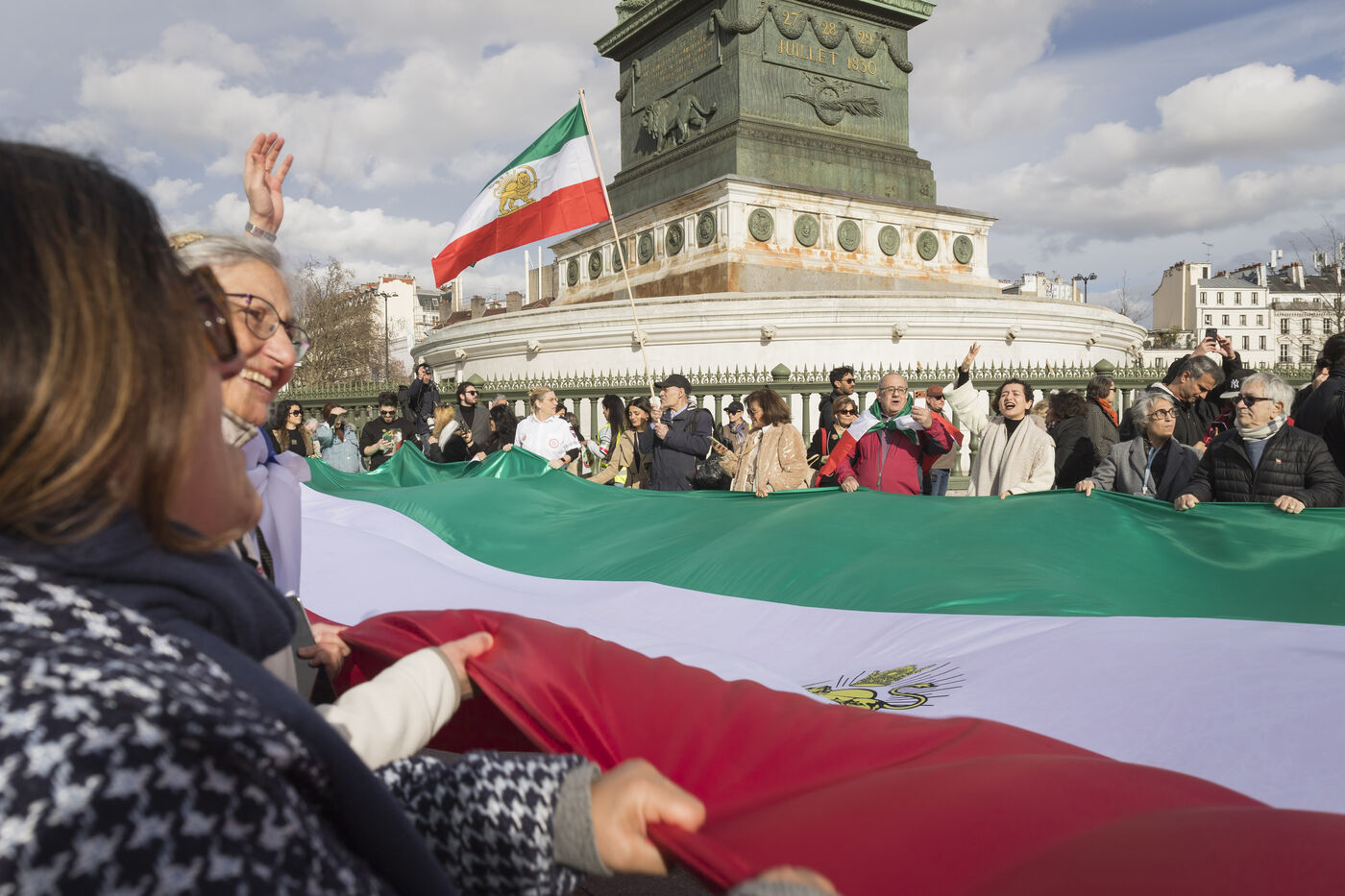 France, Paris, March 1, 2026. Following the announcement of the death of Iran's Supreme Leader, Ayatollah Khamenei, who was killed on Saturday, February 28, during a military attack by Israel and the United States, a march by the Iranian community in France took place from Place de la Bastille to Place des Pyramides. Photograph by Pascal SONNET / Hans Lucas.