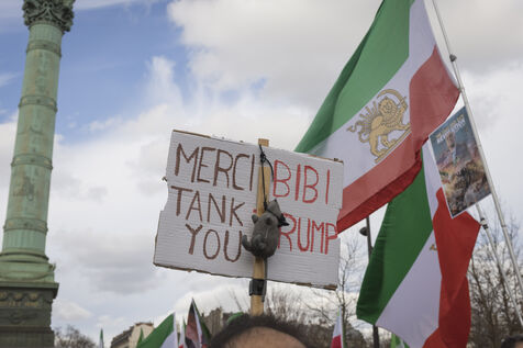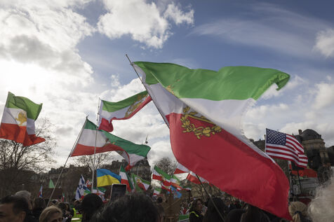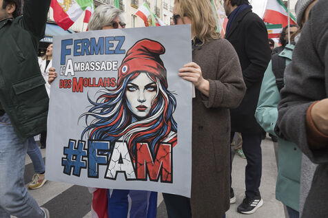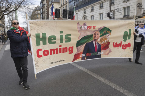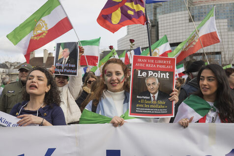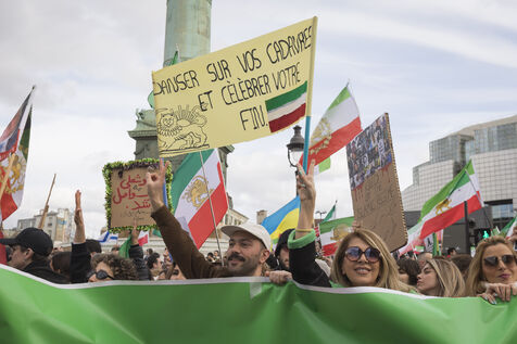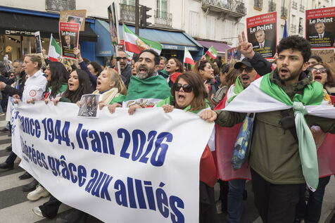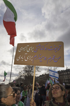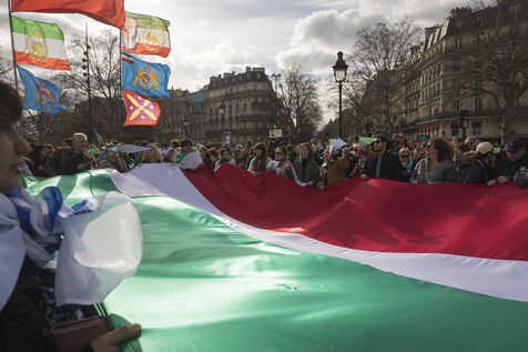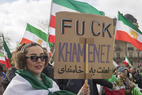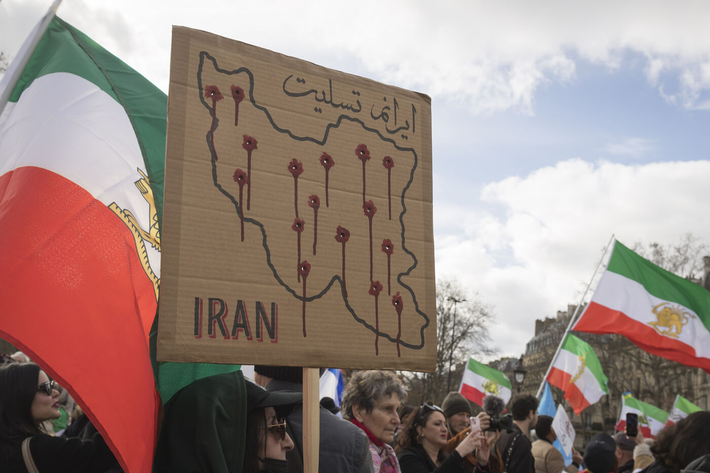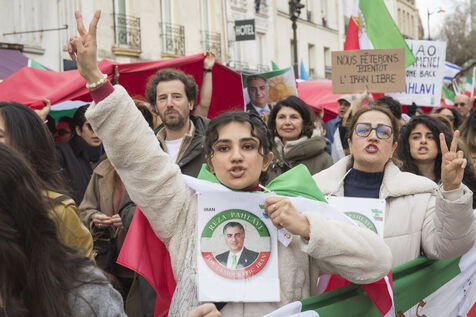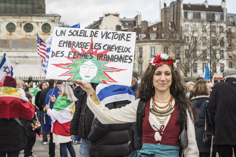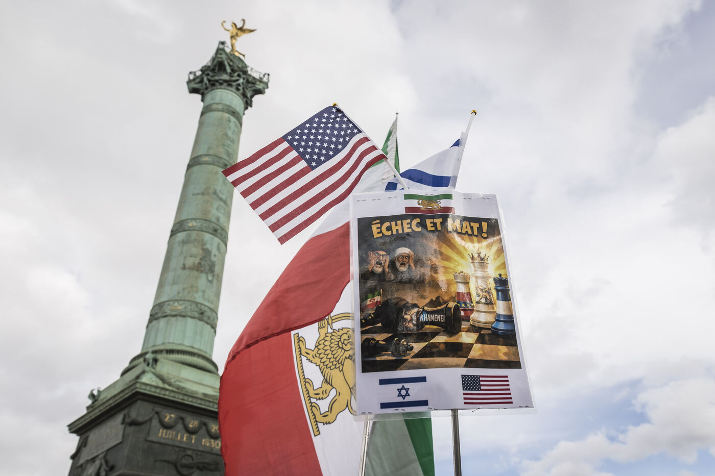 France, Paris, March 1, 2026. Following the announcement of the death of Iran's Supreme Leader, Ayatollah Khamenei, who was killed on Saturday, February 28, during a military attack by Israel and the United States, a march by the Iranian community in France took place from Place de la Bastille to Place des Pyramides. Photograph by Pascal SONNET / Hans Lucas.