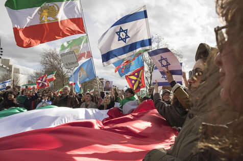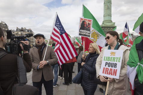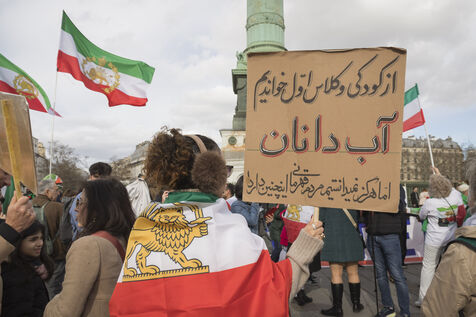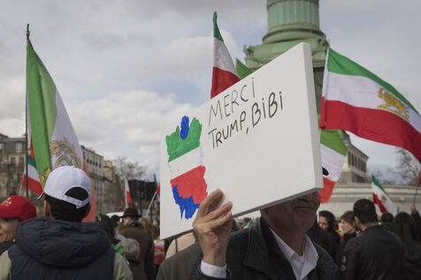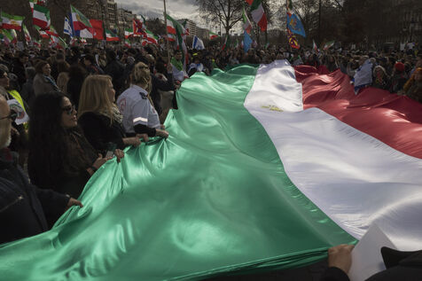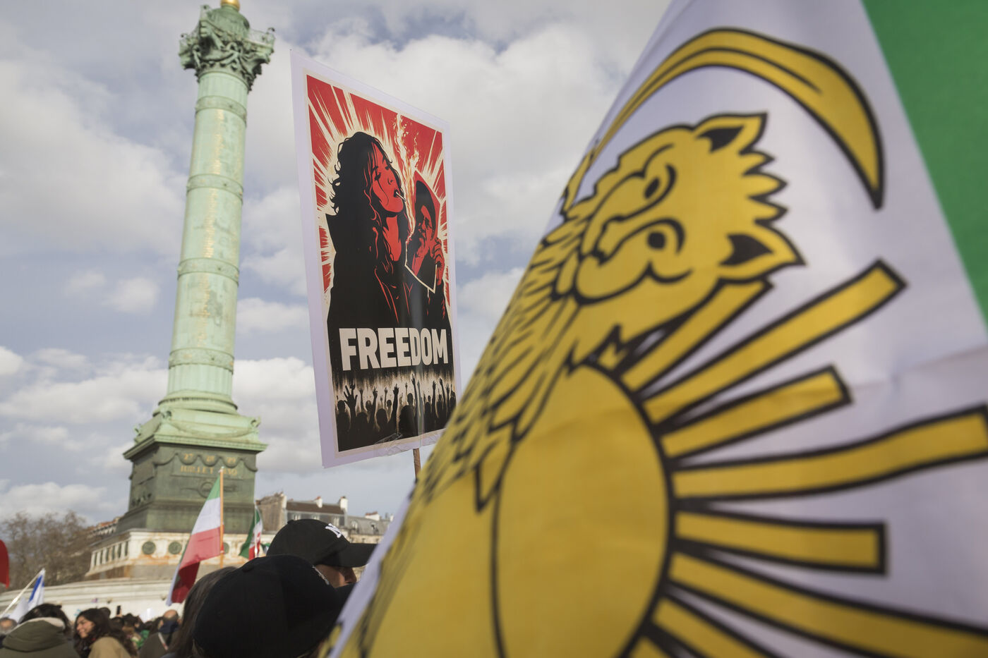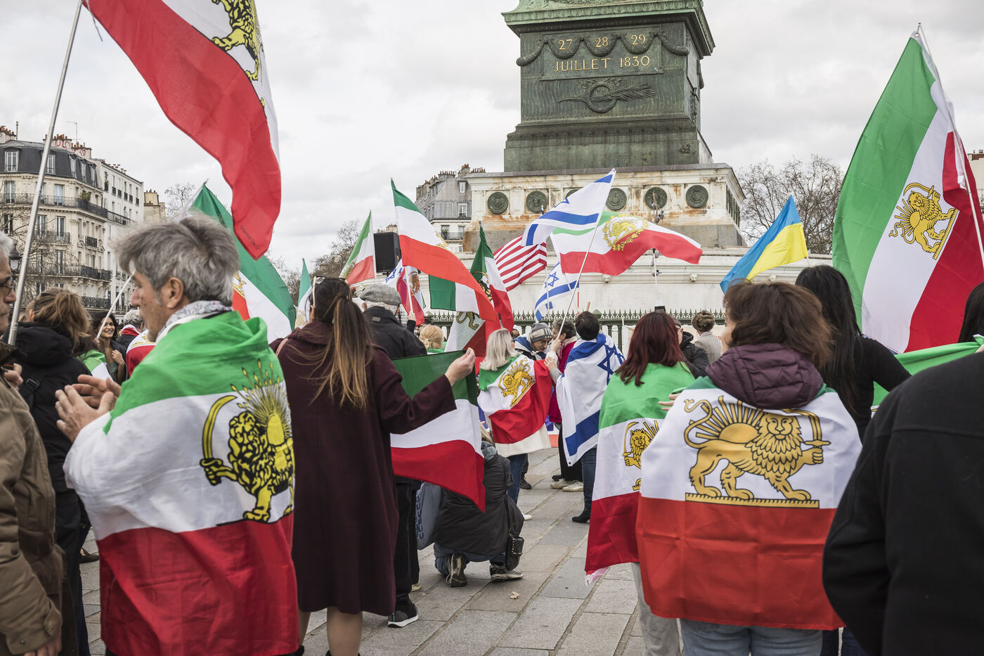 France, Paris, 2026-03-01. Suite a l annonce de la mort du guide supreme iranien, l ayatollah Khamenei, tue ce samedi 28 fevrier lors d une attaque militaire d Israel et des Etats-Unis, une marche de la communaute iranienne en France c est deroulee de la place de la Bastille a la place des Pyramides. Photographie de Pascal SONNET / Hans Lucas.