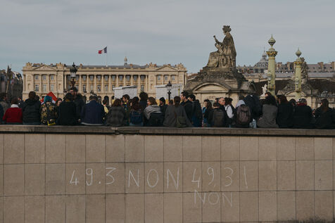 Nuit de colère et de tensions sur la Place de la Concorde en face de l'Assemblée Nationale suite à l'annonce du recours au 49.3 par Emmanuel Macron pour faire passer en force la réforme des retraites sans vote au parlement. Emmanuel Macron empêche le vote à l'assemblée et passe en force alors que 70% des français sont contre, 9 travailleurs sur 10 sont défavorables, il n'a pas la majorité au parlement.