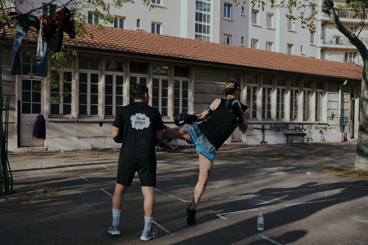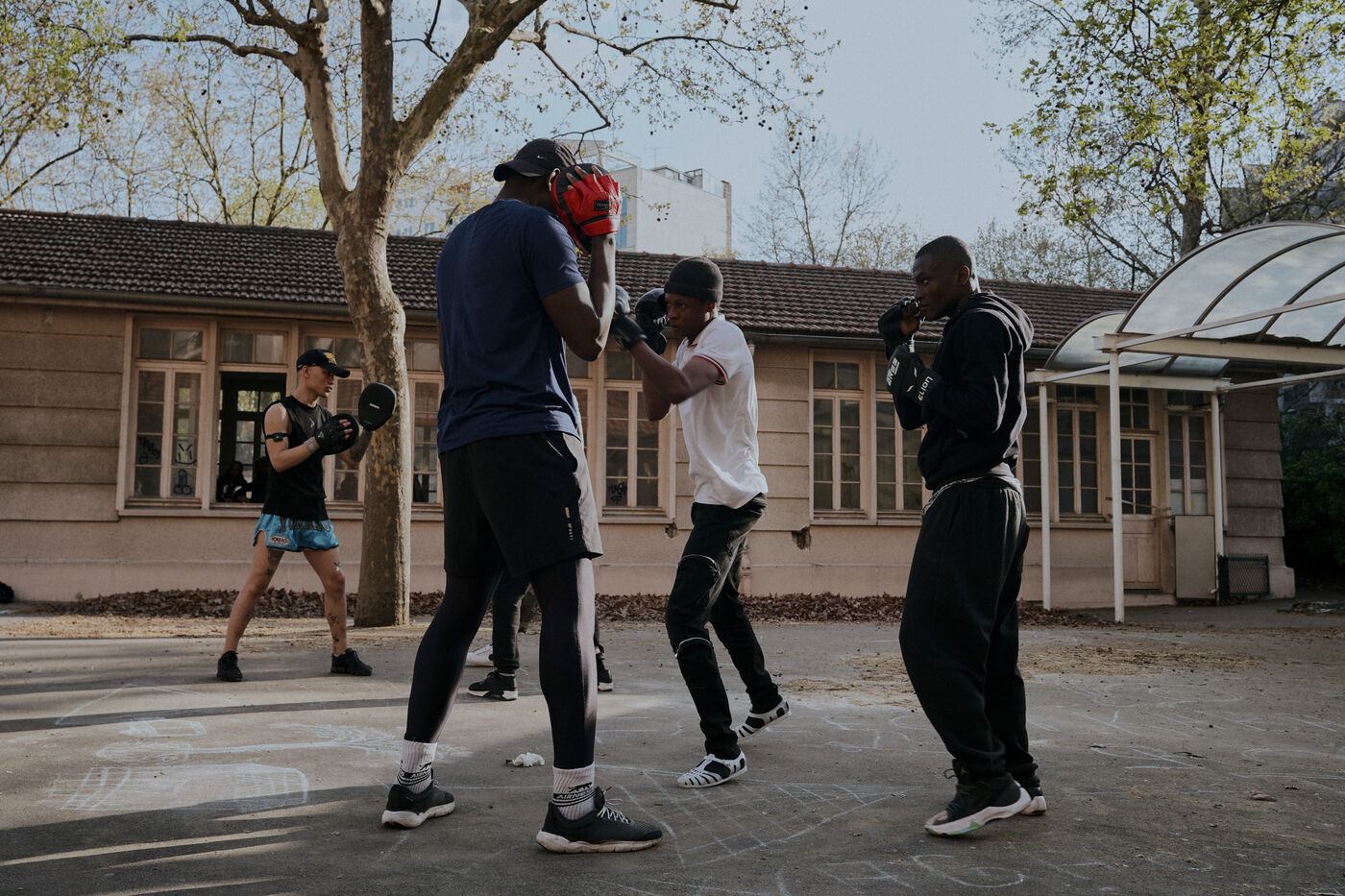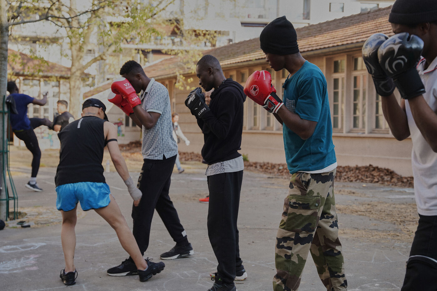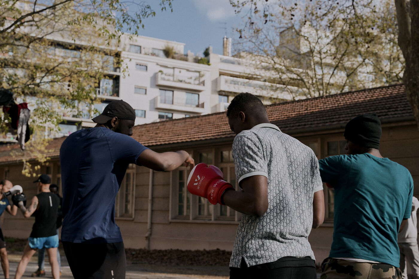 À l’intérieur, trois membres du collectif Yoga and Sport With Refugees Paris donnent un cours de boxe à de jeunes mineurs non accompagnés. Un temps pour reprendre possession de leur corps, canaliser la peur et la violence accumulées, reconstruire une confiance abîmée — et, l’espace d’un instant, sortir de l’isolement par le mouvement partagé.