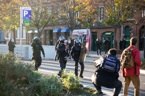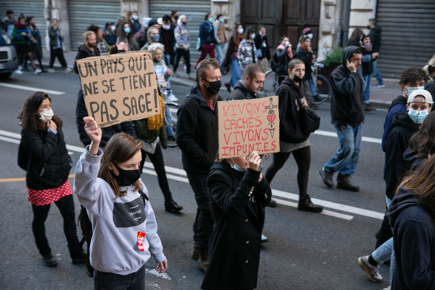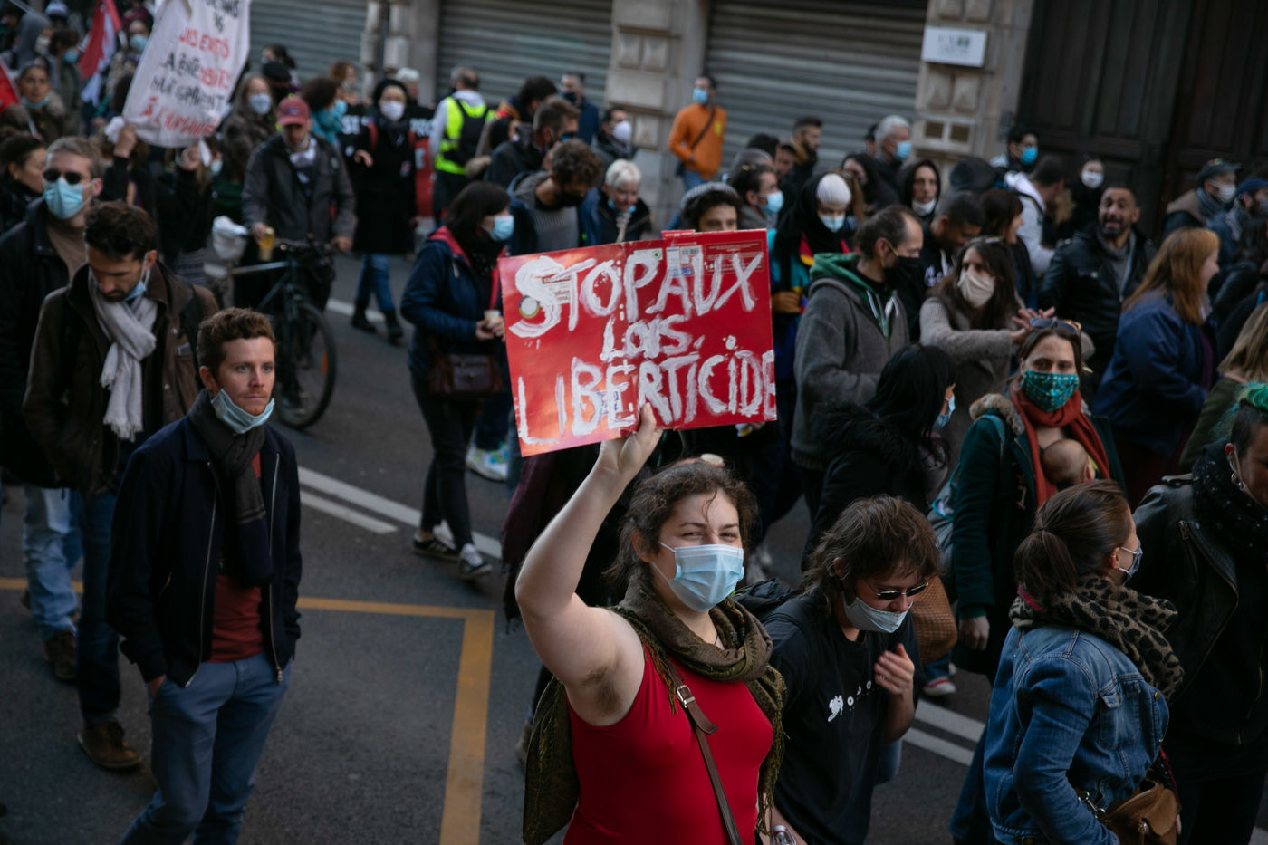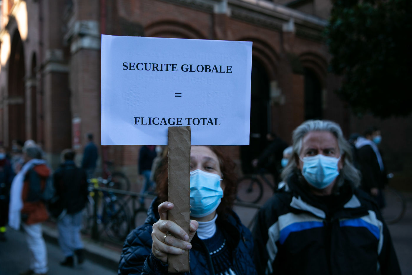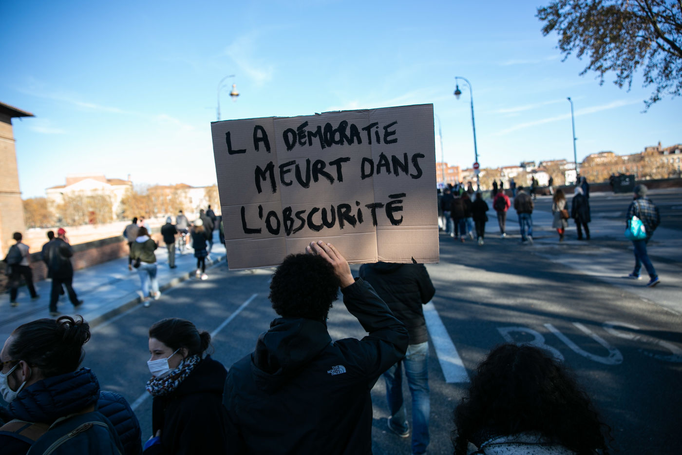 En plein confinement, plusieurs milliers de personnes ont manifesté à Toulouse contre la politique sanitaire du gouvernement, la loi dite de "sécurité globale" et pour demander plus de moyens pour l'hôpital public, 21 novembre 2020.