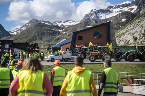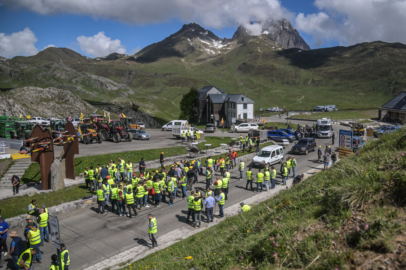 France, Col du Pourtalet, 2024-06-03. Les agriculteurs français et espagnols ont débuté une action coordonnée des deux côtés de la frontière entre la France et l'Espagne au col du Pourtalet dans les Pyrénées Atlantiques. Plusieurs dizaines de paysans espagnols (en gilets jaunes) et un peu moins de leurs homologues français (casquettes jaunes) étaient présents ce lundi matin. Au programme: blocage de la circulation des poids lourds, filtrage des voitures, barbecue. Le mouvement de contestation devrait durer 24h. Ils dénoncent les contraintes européennes et ce qu?ils estiment être des promesses non tenues par le gouvernement français. La CR 64 réclame toujours le GNR à 1 euro TTC.