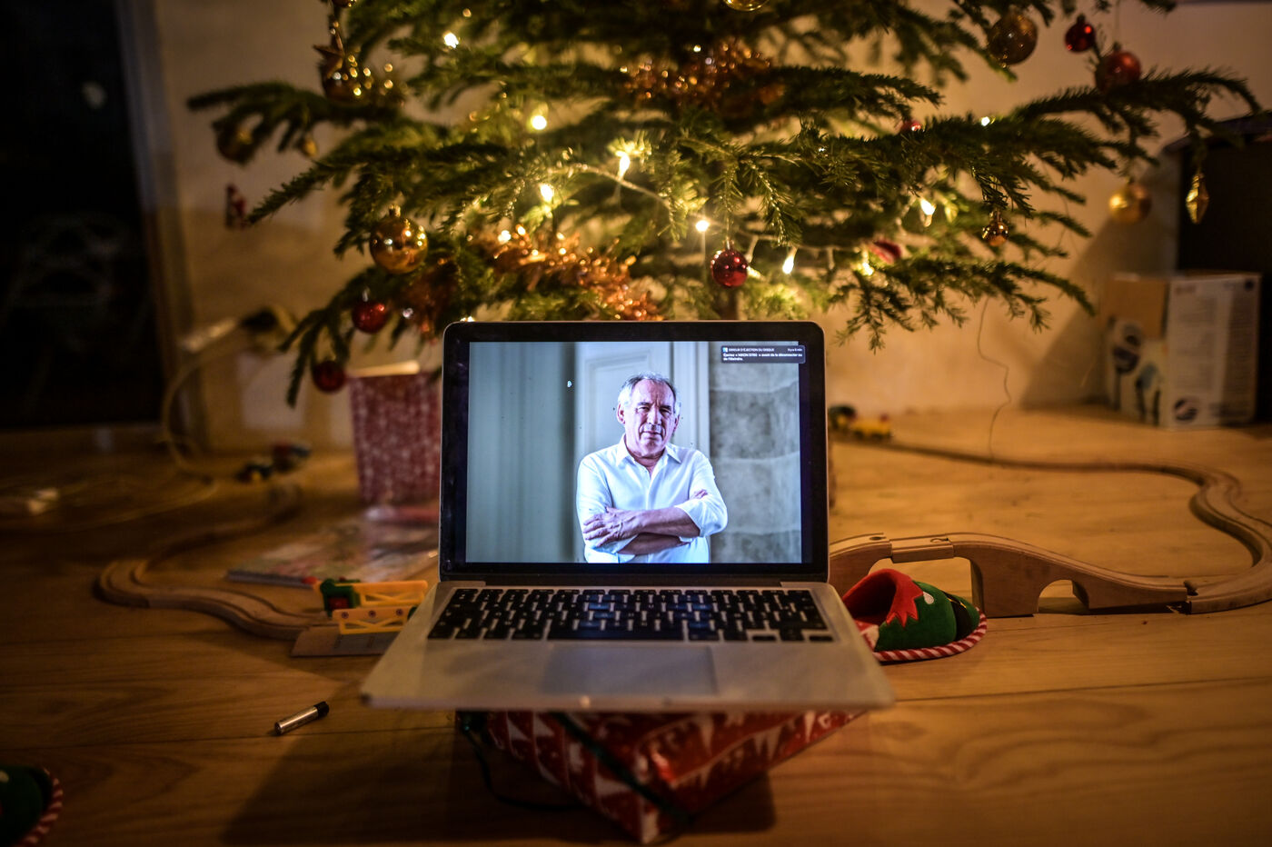Staged portrait of Francois Bayrou and Emmanuel Macron on a computer screen placed at the foot of the Christmas tree like a gift from Santa Claus, in Pau on December 13, 2024. Michel Barnier's government was overthrown by a motion of censure supported by the extreme right and the left. Emmanuel Macron must appoint a new Prime Minister capable of gathering a majority and getting the 2025 budget adopted