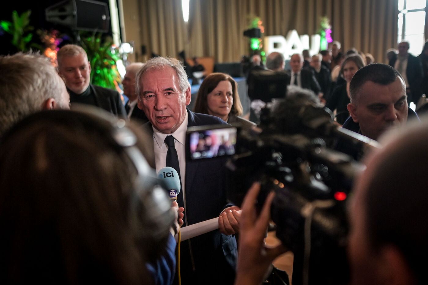 François Bayrou, mayor of Pau, president of the Pau Bearn Pyrenees urban community, president of the communal center of Social Action and prime minister presents his wishes to municipal staff in the ballroom of the Palais Beaumont in Pau on January 20, 2024. Here taking selfies with municipal agents. An illustration of the accumulation of mandates and the omnipresence of the politician in Paris and in the provinces. Here in an interview with national and local media.