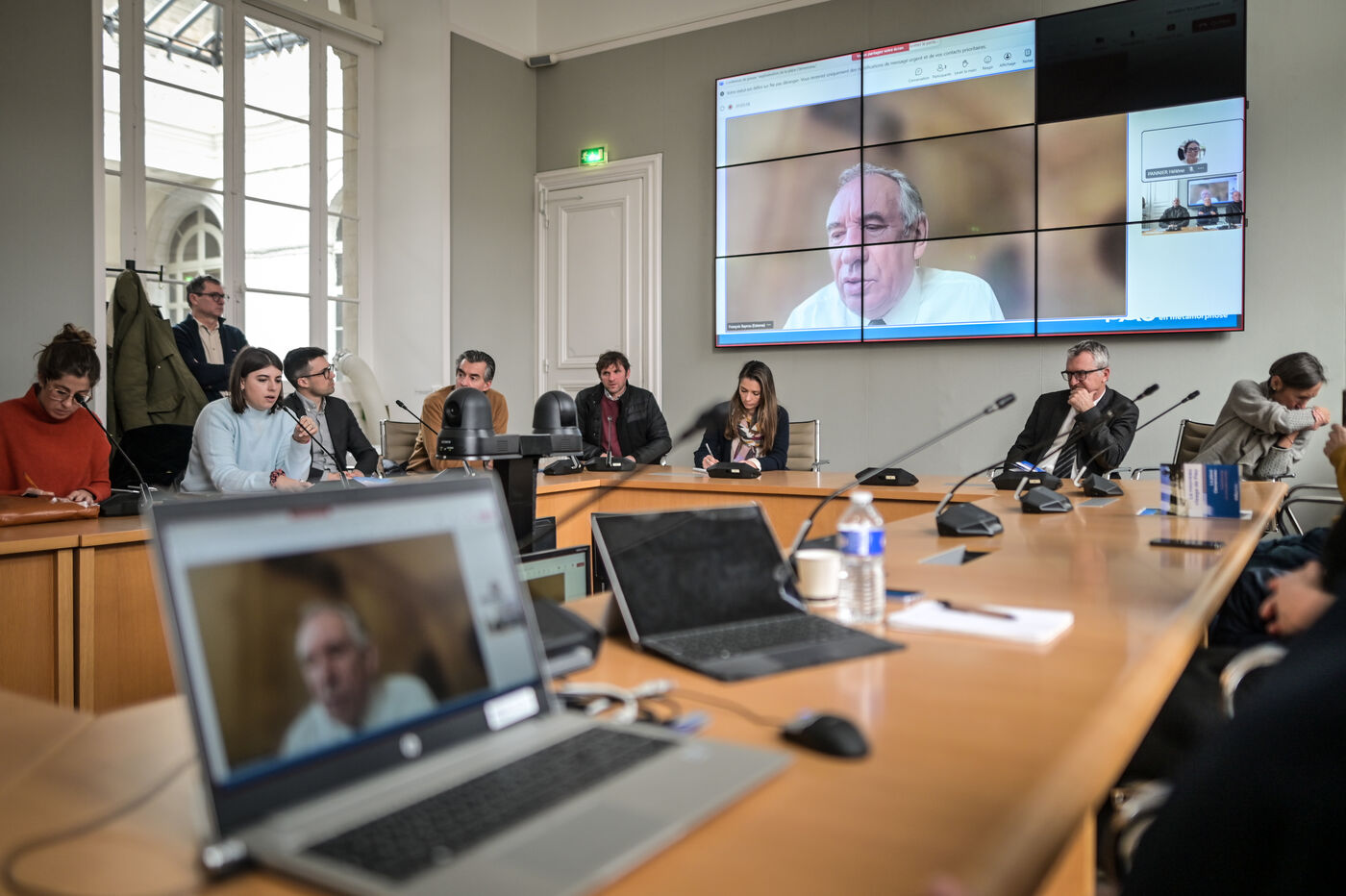 In the meeting room of the Pau town hall Francois Bayrou presents remotely in visionconference the project to revegetate the central square of the city, Place Clemenceau in Pau on February 8, 2024. An image that can illustrate the accumulation of mandates, the omnipresence of the Prime Minister. The latter refused to answer questions concerning the right of the soil and the Betharram scandal. On the other hand, he reacted to the remarks of the point which speaks of "whim" when it evokes the pressures made by Bayrou towards Air France concerning the Pau Orly line