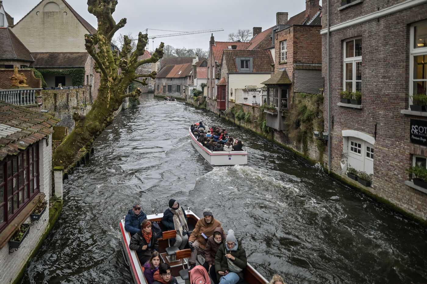 Bruges, the Venice of the North, attracts visitors for a boat trip through its picturesque canals. Aboard the sightseeing boats, passengers admire the medieval brick facades, stone bridges and the reflections of historic houses in the dark water. On the riverbank, groups of visitors stroll along the cobbled streets, lingering on the iconic bridges, offering unique views of the winding canals and period buildings.