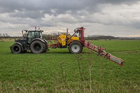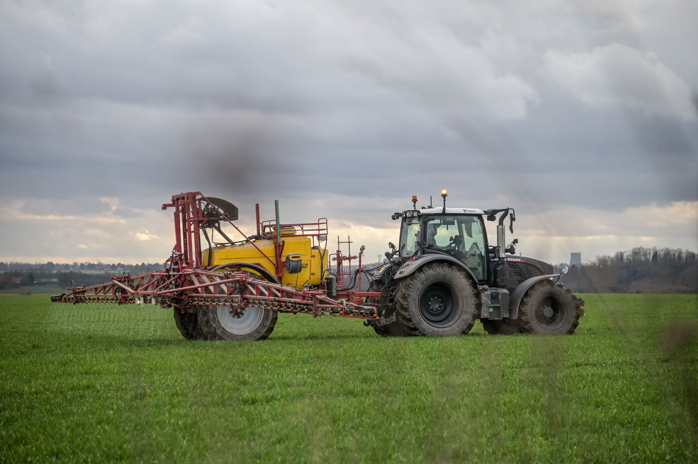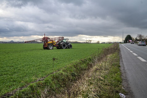 In the north of France, a farmer sprays his field using a tractor equipped with an agricultural sprayer. Under a threatening sky, the machine travels through the green crops while spreading, illustrating the use of inputs in modern agriculture. In the background, a slag heap and a power plant bear witness to the region's industrial and energy past, contrasting with current issues of sustainability and environmental impact.