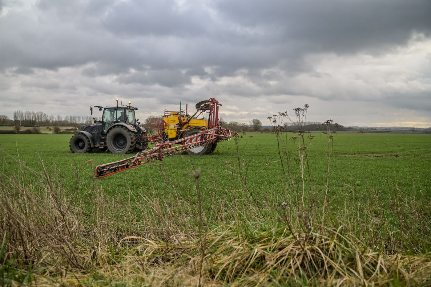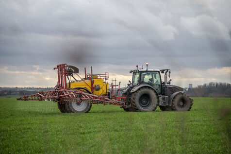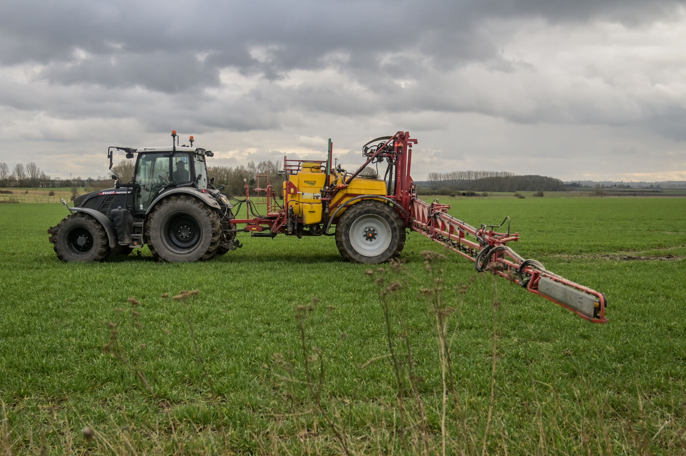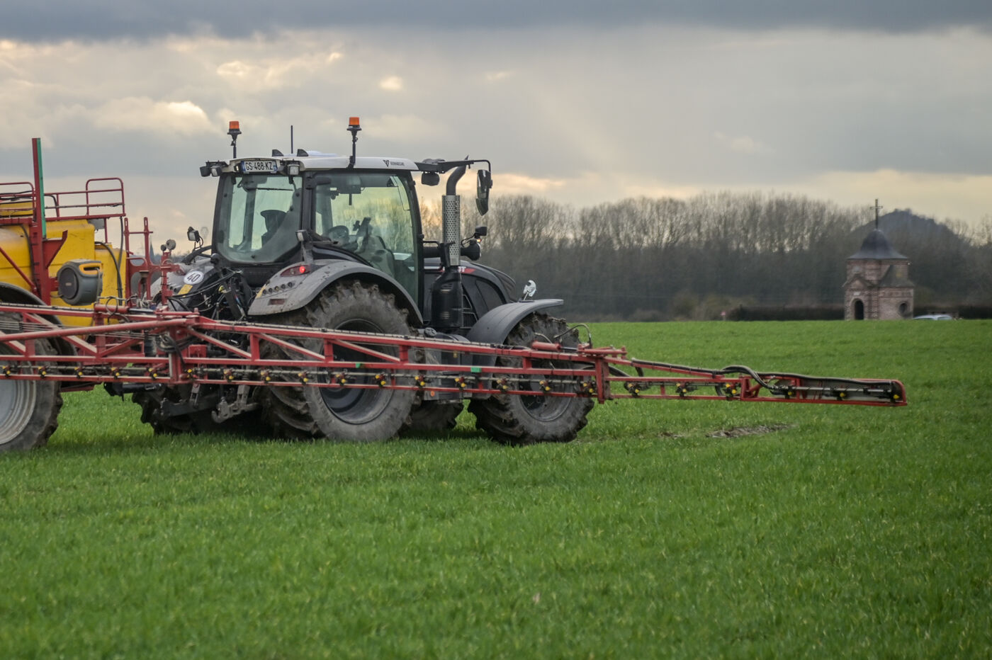 Dans le nord de la France, un agriculteur pulvérise son champ à l'aide d'un tracteur équipé d'un pulvérisateur agricole. Sous un ciel menaçant, la machine parcourt les cultures verdoyantes en effectuant l epandage, illustrant l’usage des intrants dans l’agriculture moderne. En arrière-plan, un terril et une centrale témoignent du passé industriel et énergétique de la région, contrastant avec les enjeux actuels de durabilité et d’impact environnemental.