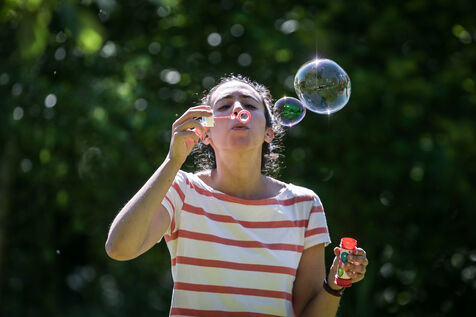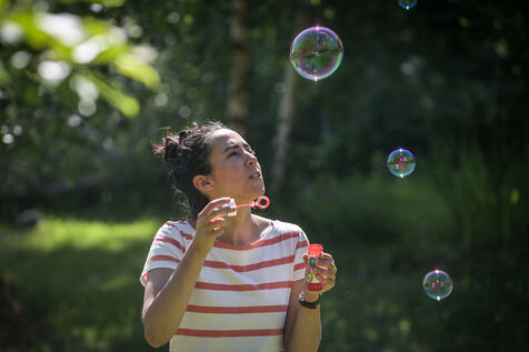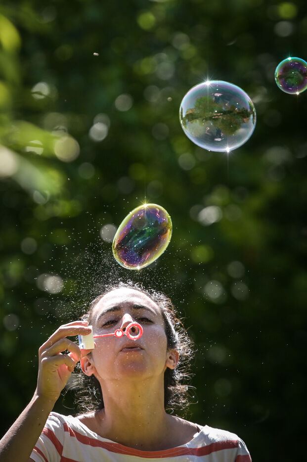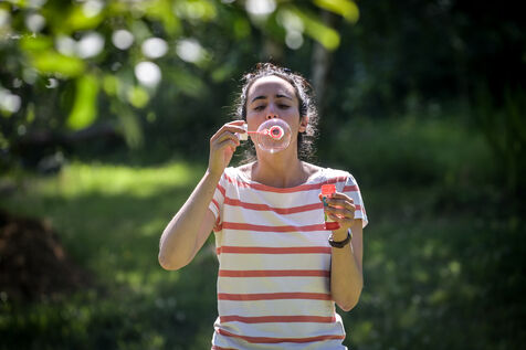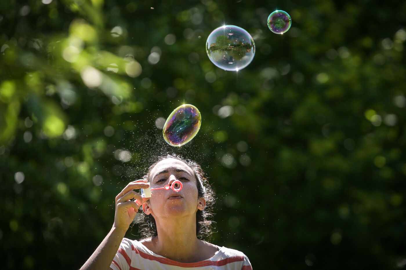 A woman blows soap bubbles in a lush green setting bathed in light. The sun illuminates the bubbles, revealing iridescent and fragile reflections, suspended in the air. Shimmering sparkles accentuate the magic of the moment, while the blurred background reinforces a soft and dreamlike atmosphere. This fleeting moment evokes childhood, spontaneity and the carefree nature of a simple game, captured in all its poetry. The scene exudes serenity and reverie, where light and air intertwine in an ephemeral dance.