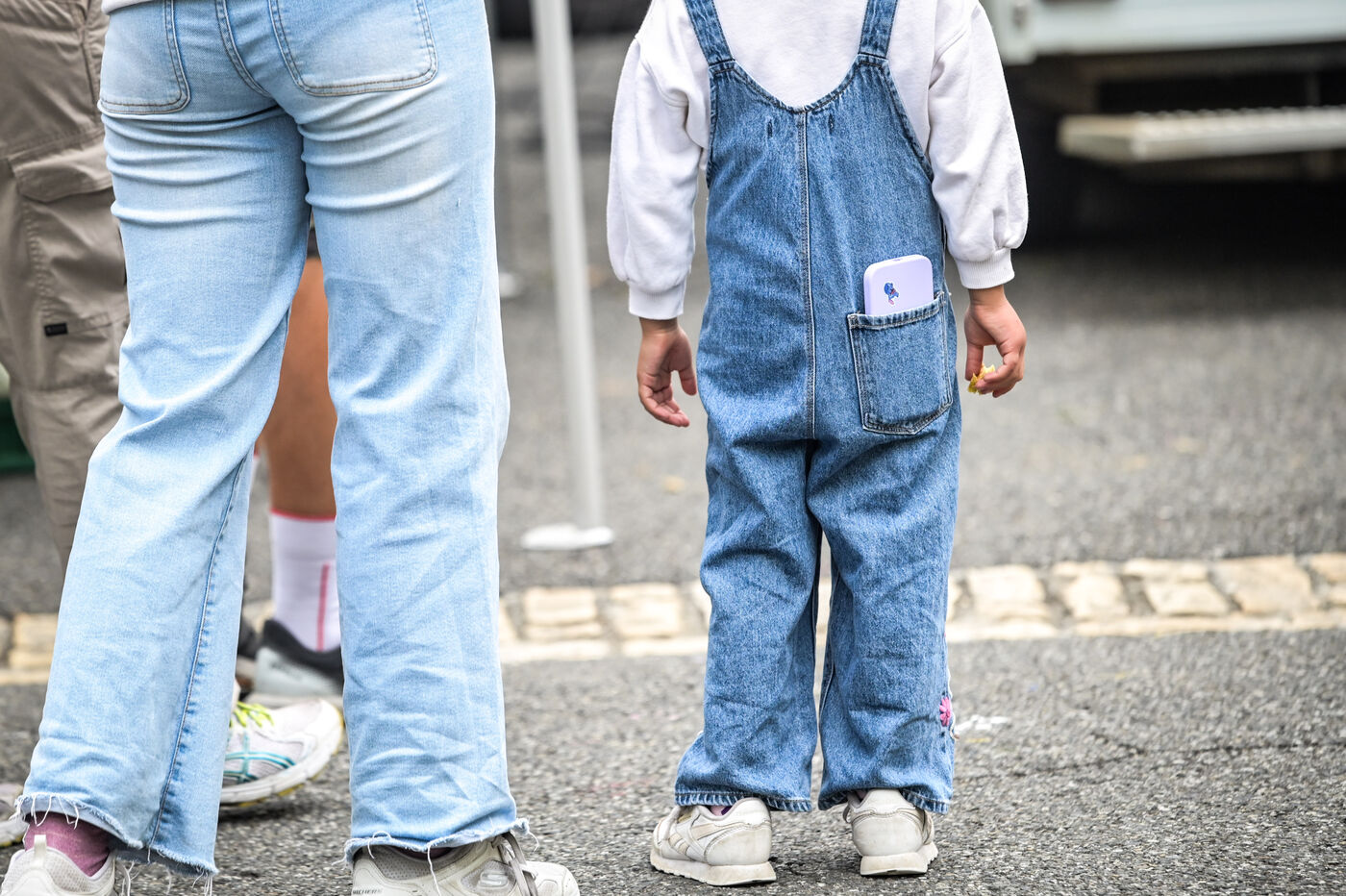 Un enfant en salopette en jean et baskets blanches marche dans un marché à Navarrenx le 27 aout 2025. Dans sa poche arrière, un smartphone dépasse, symbole de l’omniprésence du téléphone portable et du numérique dès l’enfance. Cette scène de rue illustre la vie quotidienne, la mixité générationnelle et les usages précoces des écrans. À travers cette image de marche et de dos, on perçoit l’enfance connectée, le lien entre société et technologie, au cœur de la ville et de l’espace urbain.