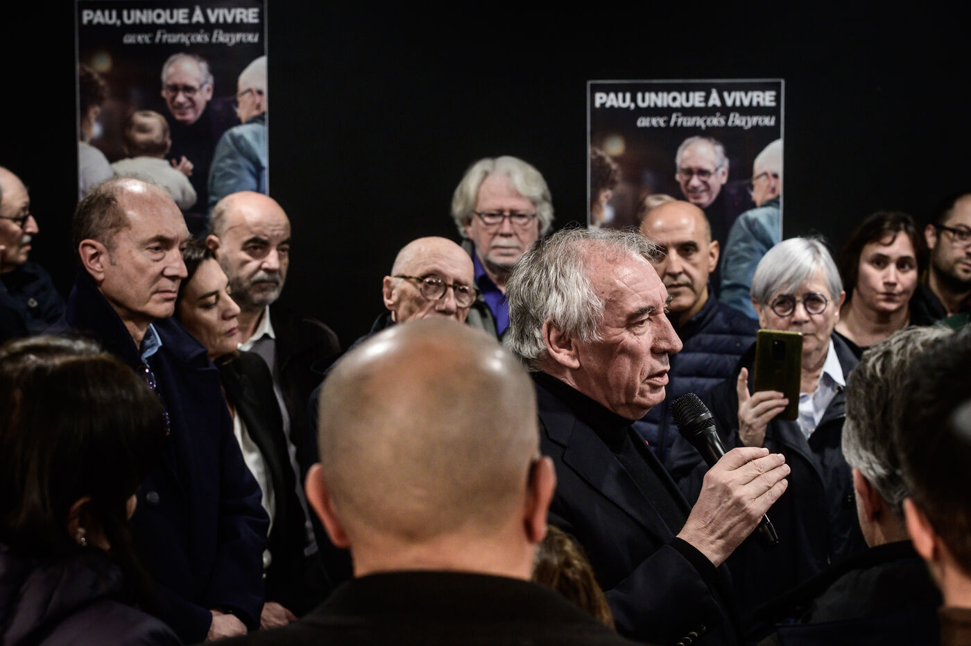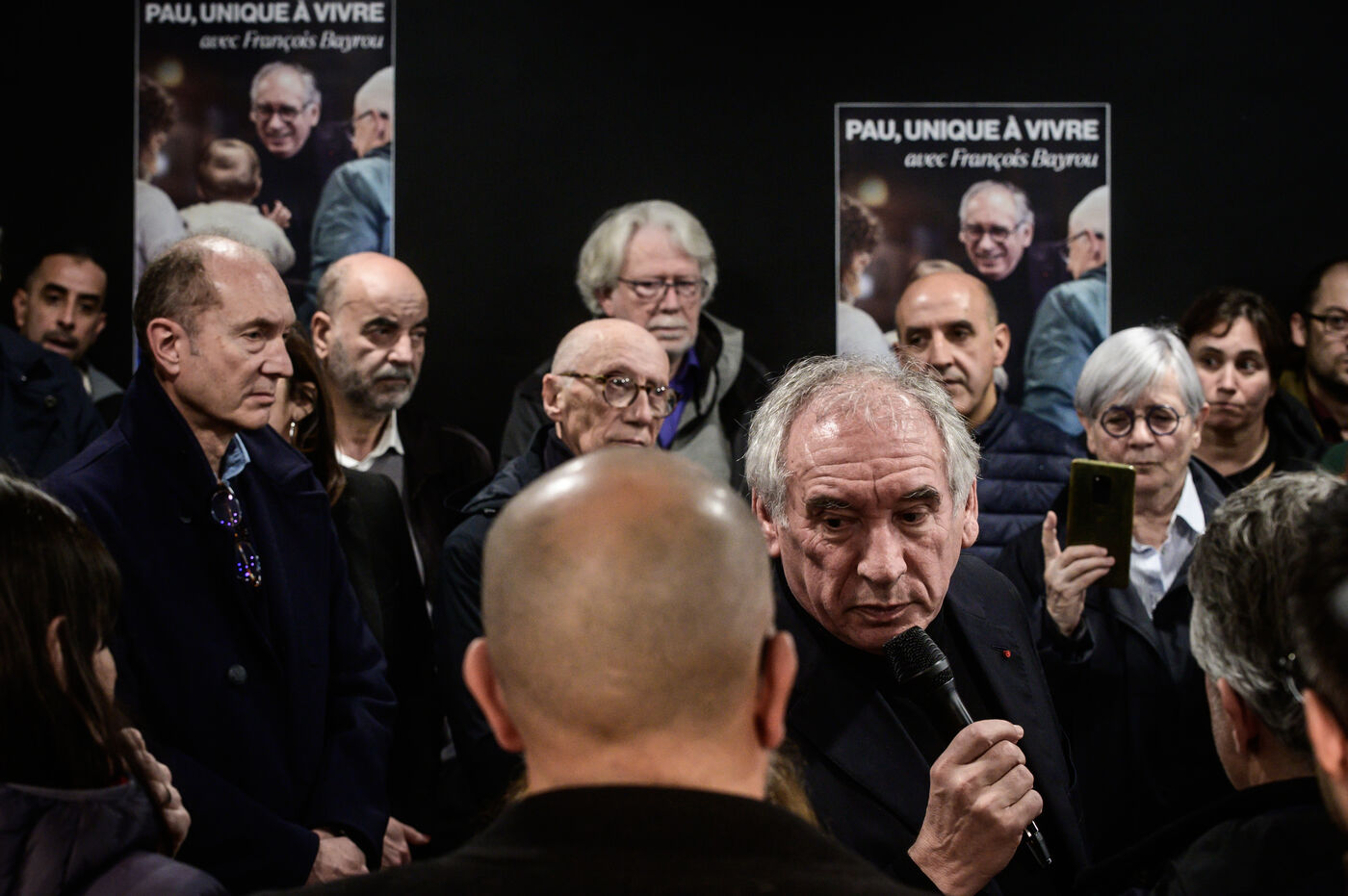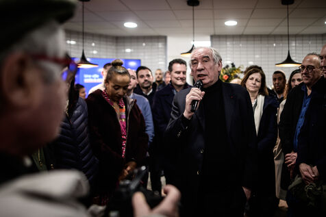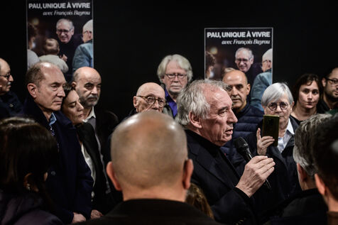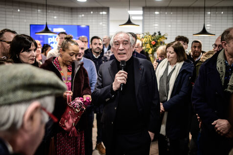 Francois Bayrou inaugurates his municipal campaign headquarters opposite Les Halles, a flagship urban project of his outgoing term, surrounded by his supporters, elected officials and likely running mates, in Pau, Nouvelle-Aquitaine, France, February 8, 2024.