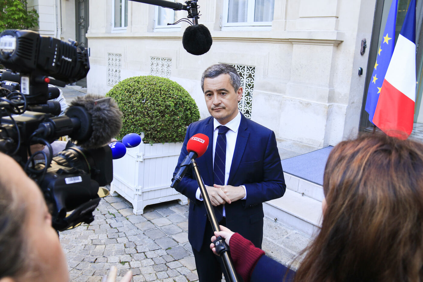 France, Paris, 2023-04-20. The Minister of the Interior and Overseas Gerald Darmanin during a micro-tense on road safety. Photograph by Quentin de Groeve / Hans Lucas