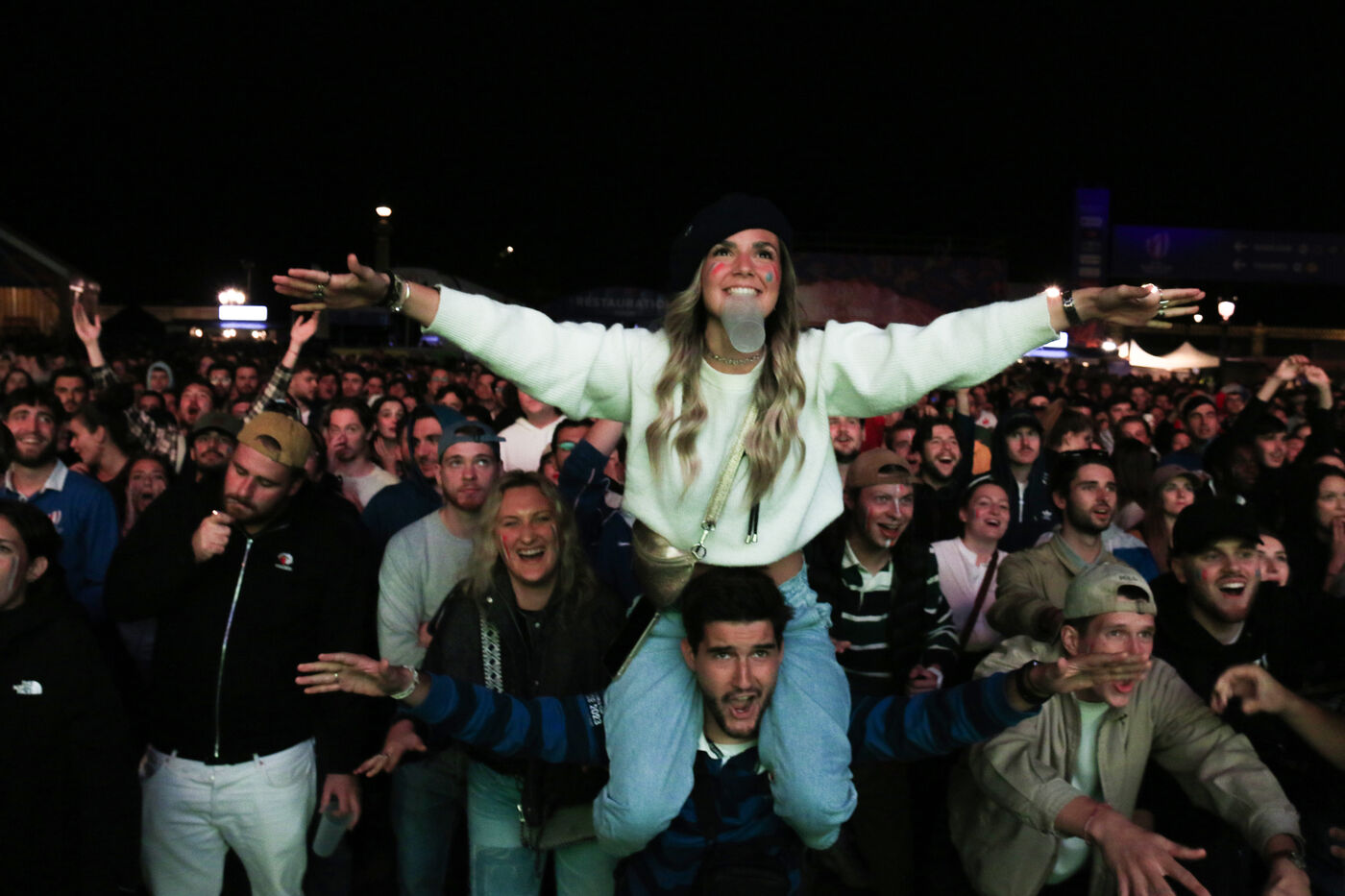 France, Paris, 2023-09-21. Les supporters français à la Fan Zone de Place de la Concorde lors de France - Namibie pour la Coupe du Monde de Rugby. Photographie de Quentin de Groeve / Hans Lucas