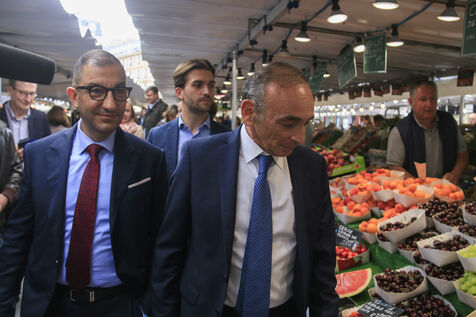 Eric Zemmour and Reconquete candidate for the legislative elections Jean Messiha visiting the Neuilly market in Hauts-de-Seine on June 19, 2024.