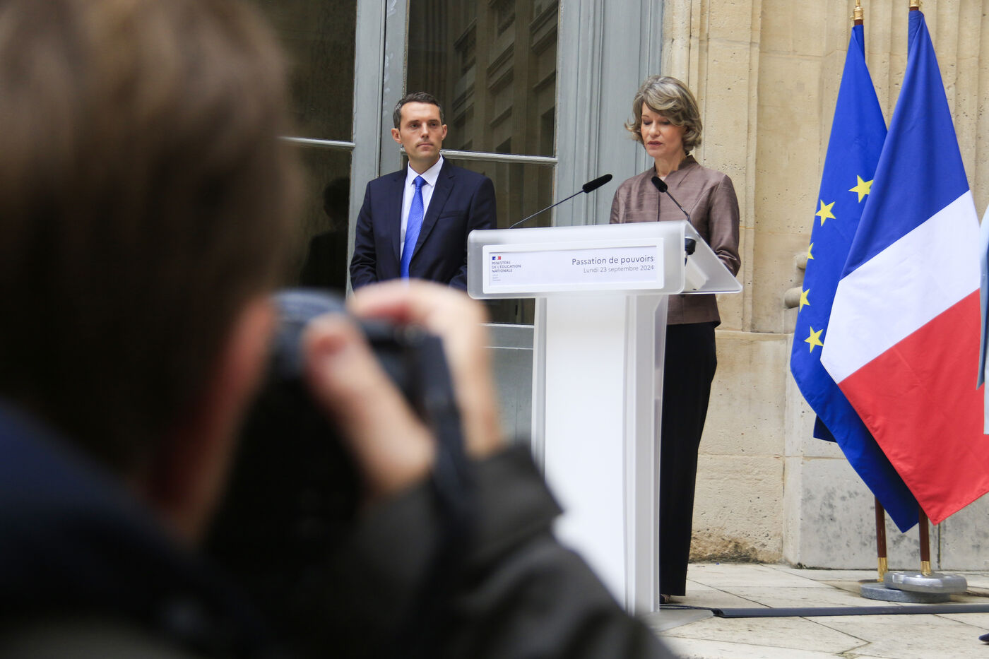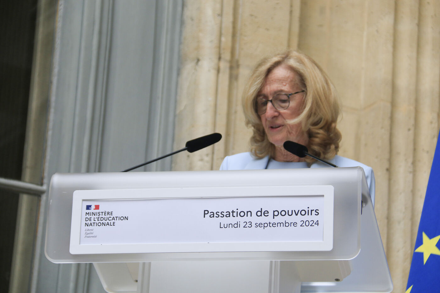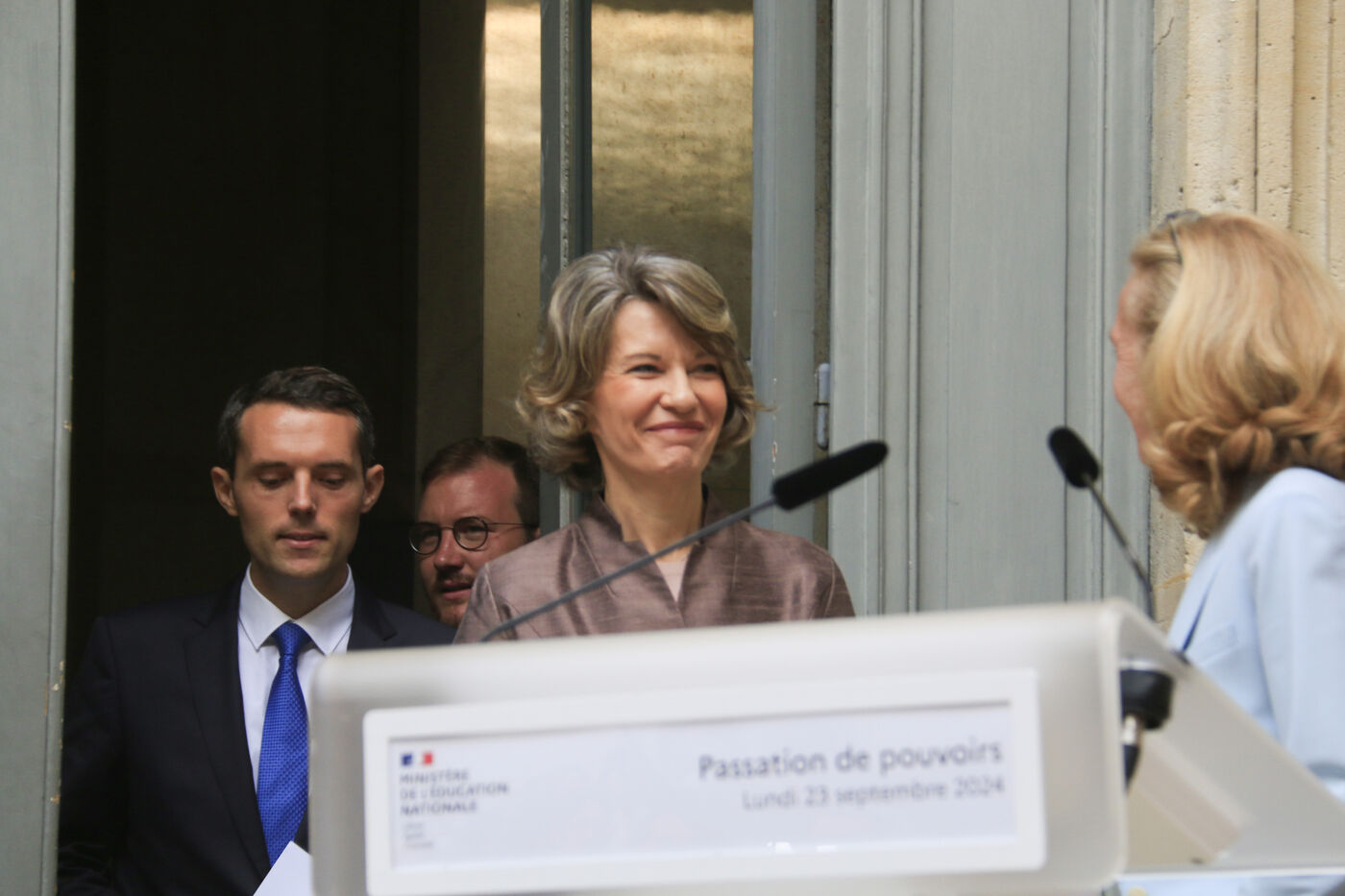Passation de pouvoir entre Nicole Belloubet et Anne Genetet au Ministère de l’Éducation Nationale à Paris le 23 septembre 2024.