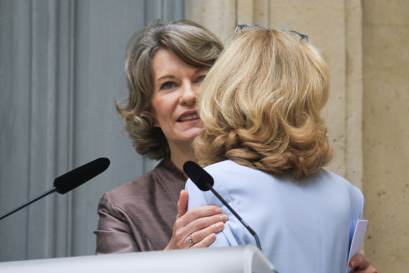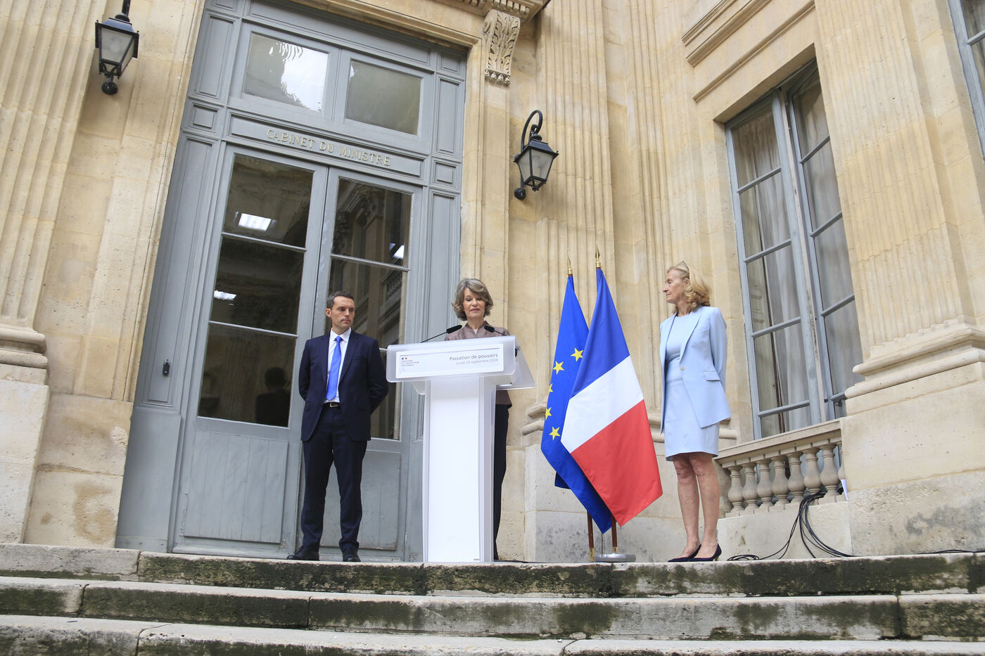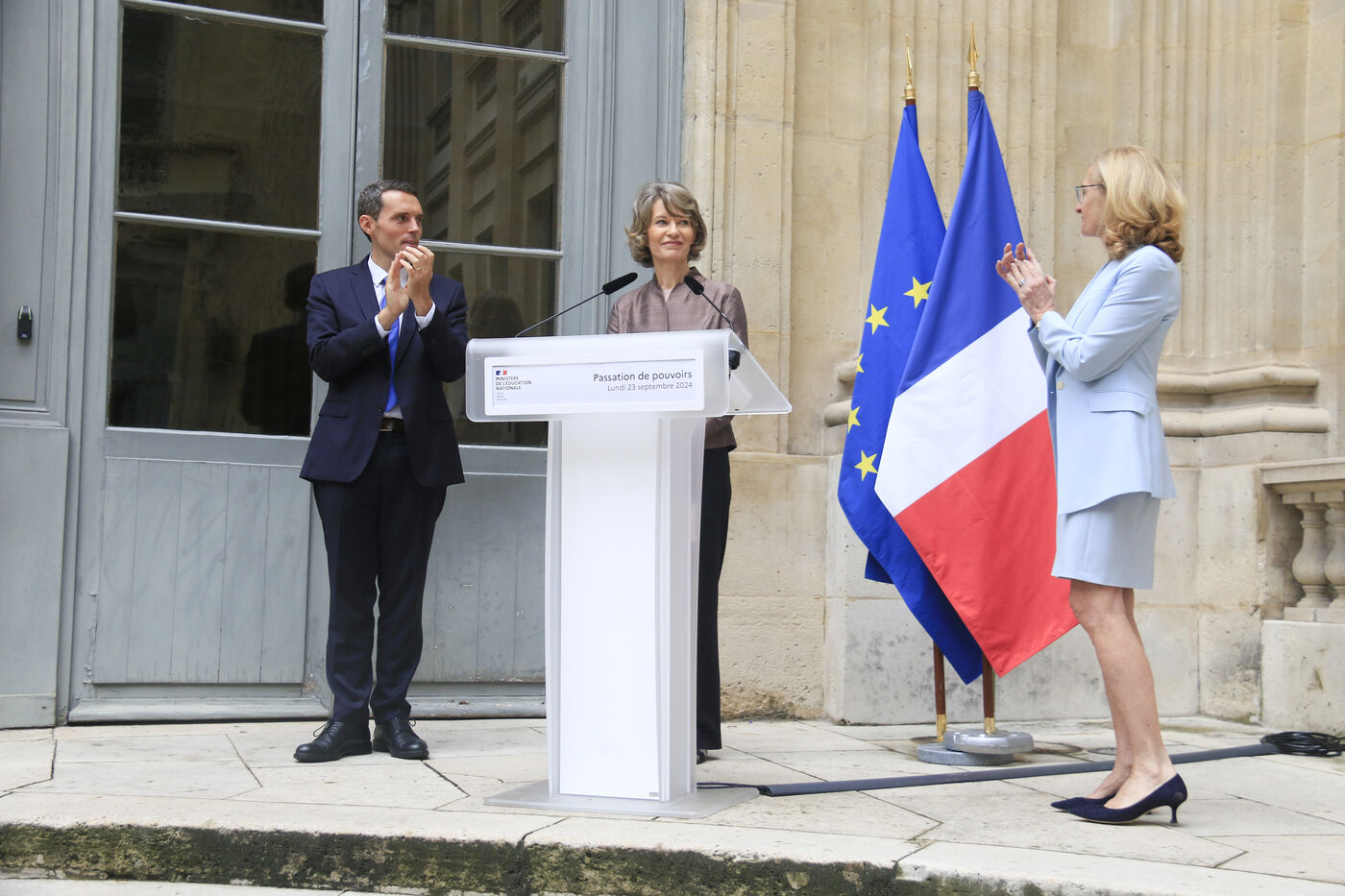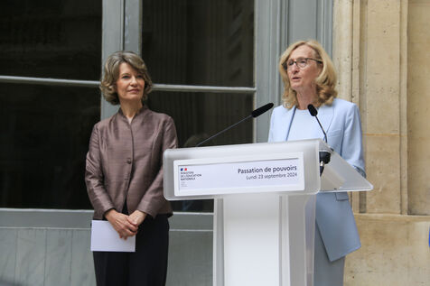 Passation de pouvoir entre Nicole Belloubet et Anne Genetet au Ministère de l’Éducation Nationale à Paris le 23 septembre 2024.
