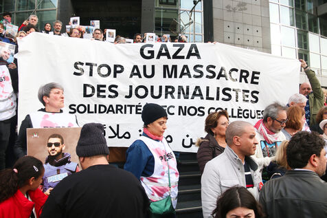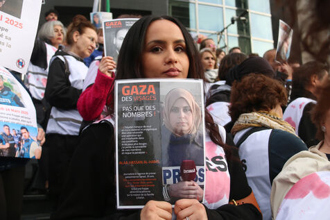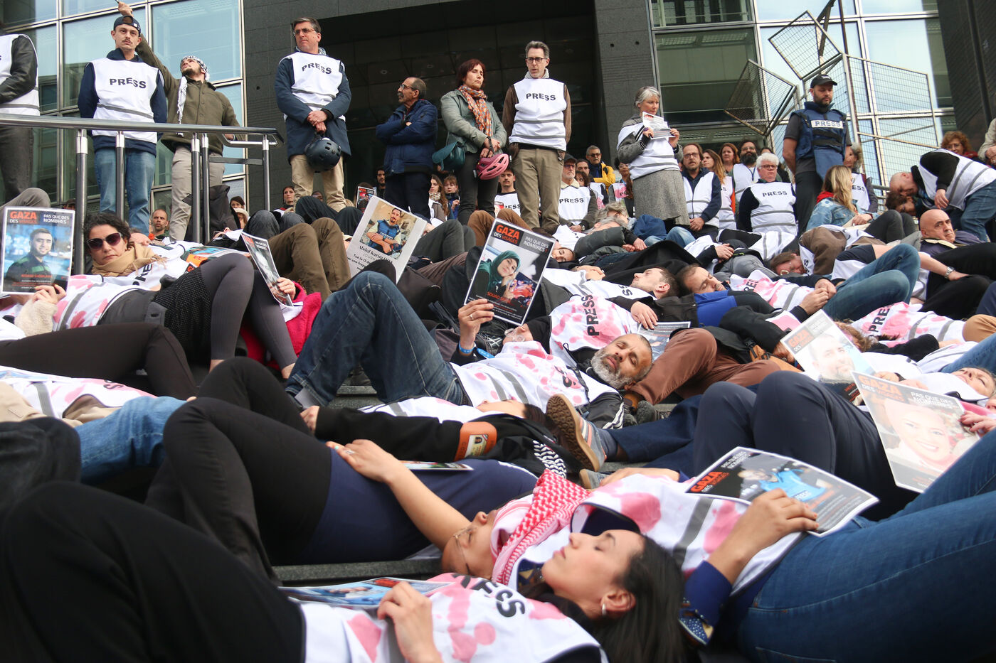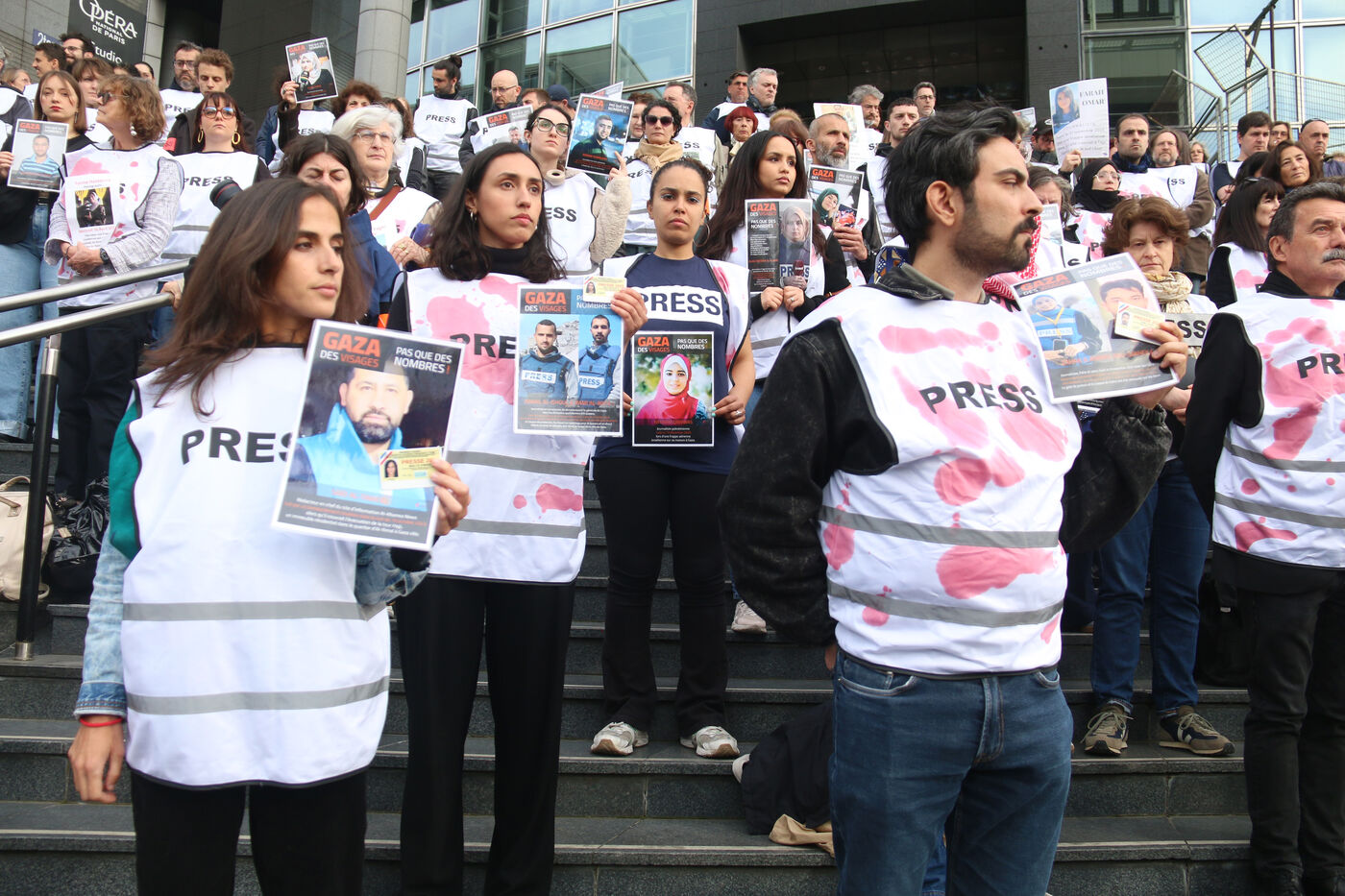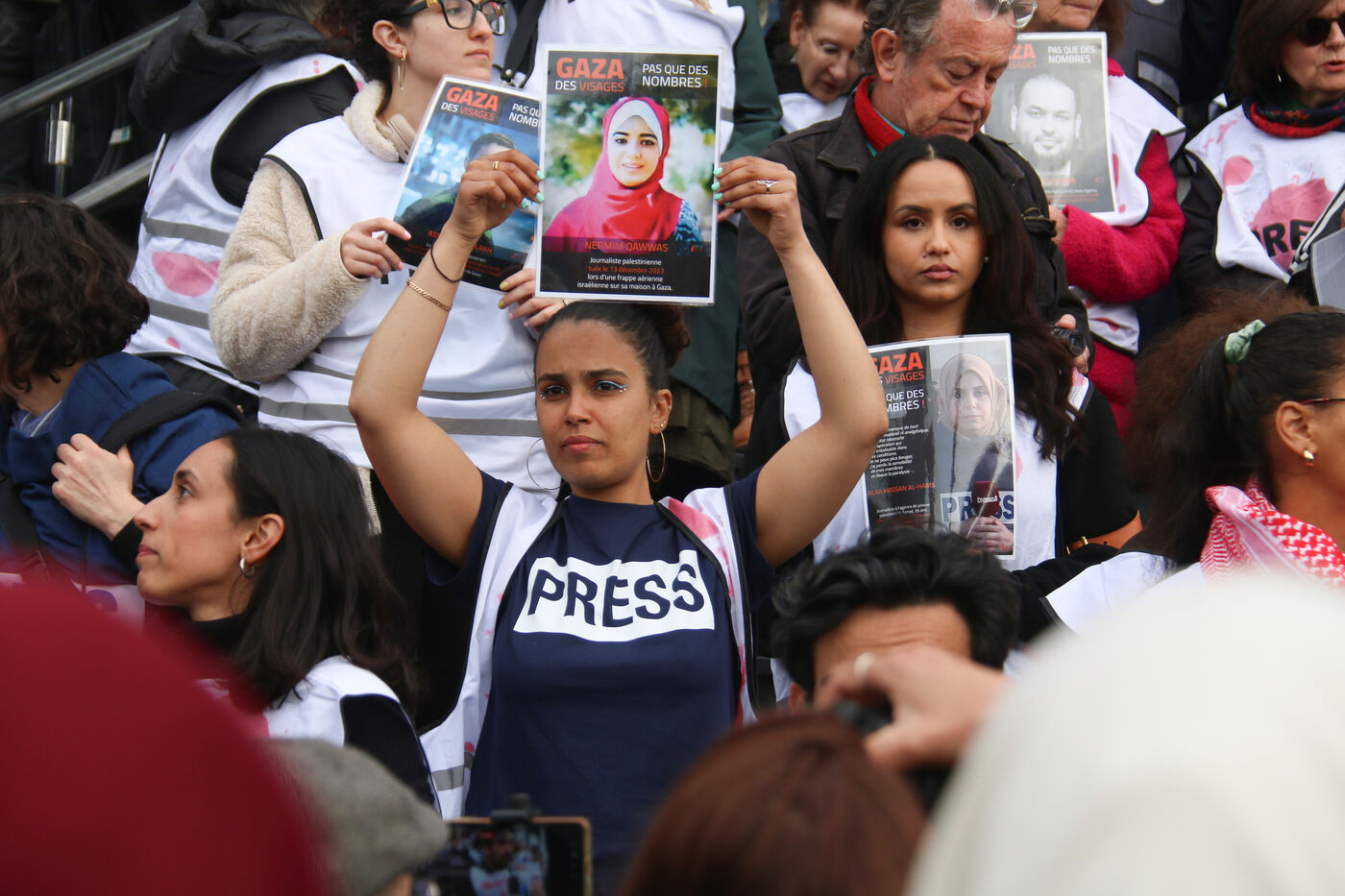 Journalists gathered in solidarity with their Palestinian colleagues killed in Gaza during the Israeli-Palestinian conflict in front of the Bastille Opera in Paris on April 16, 2025.