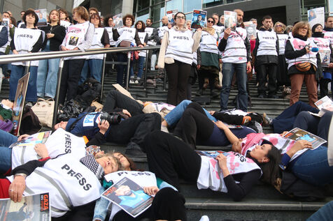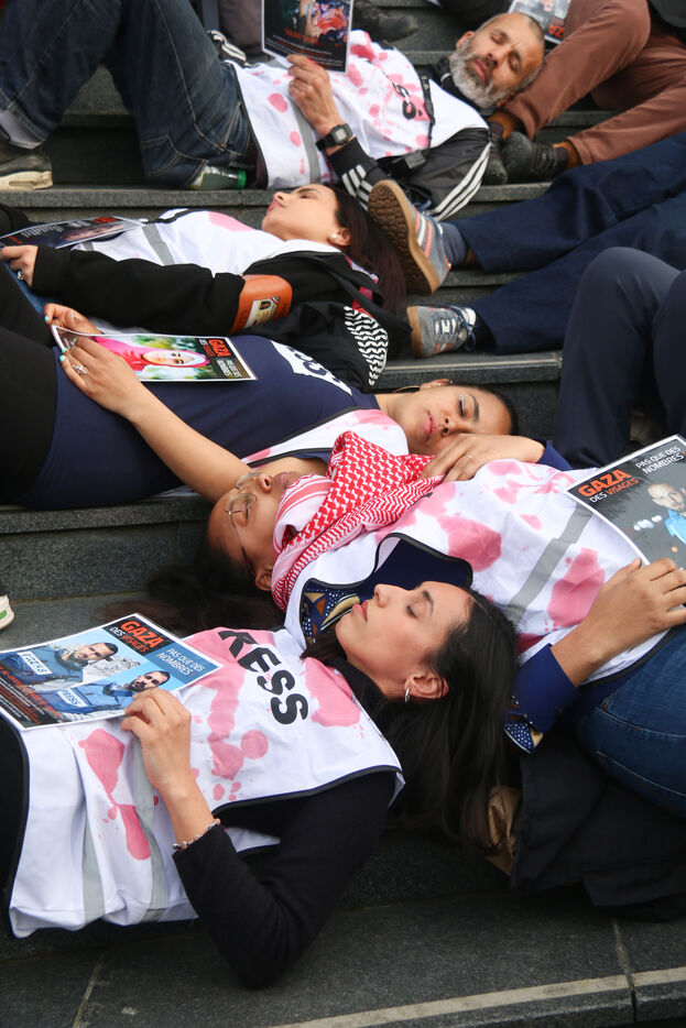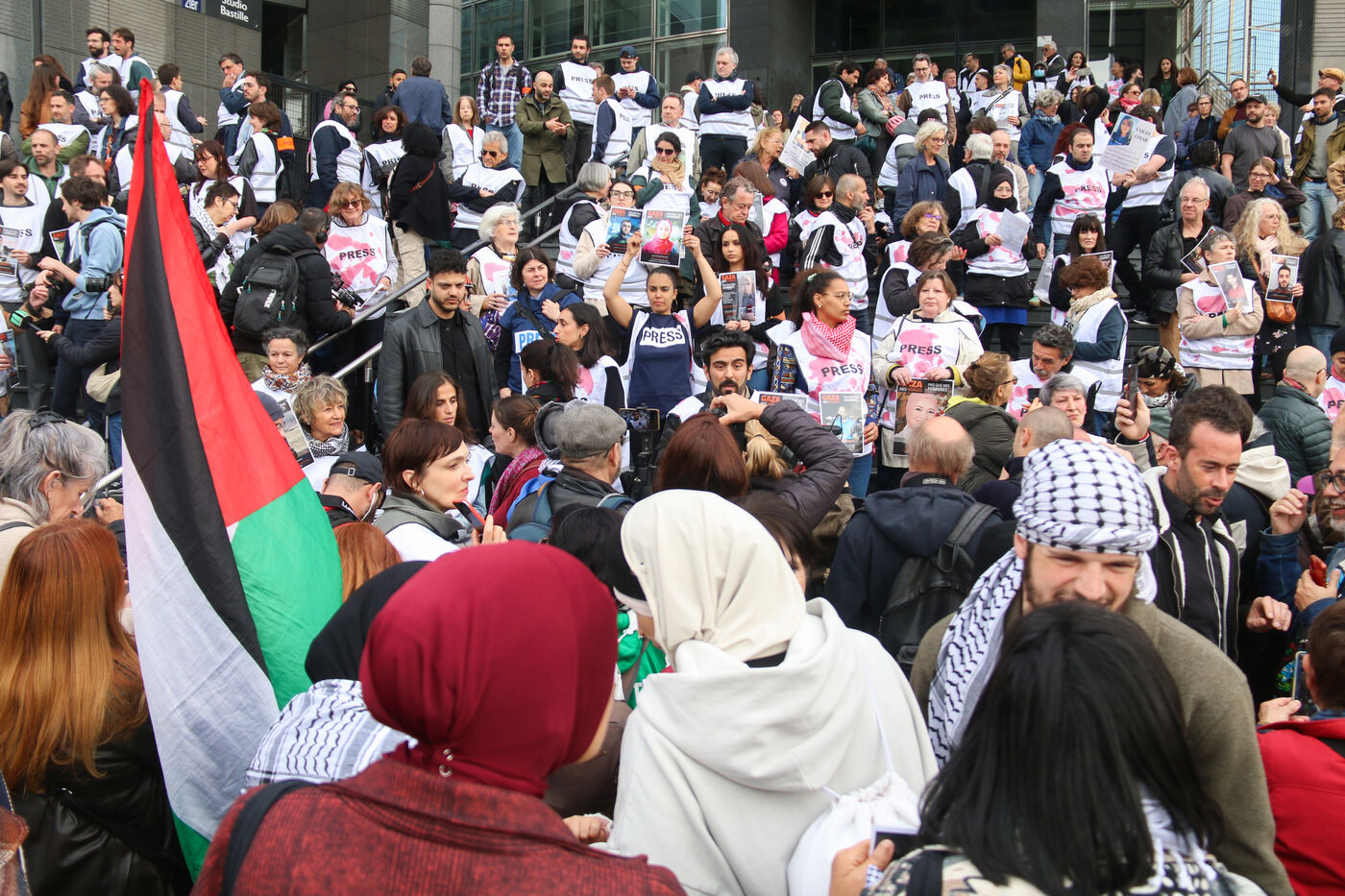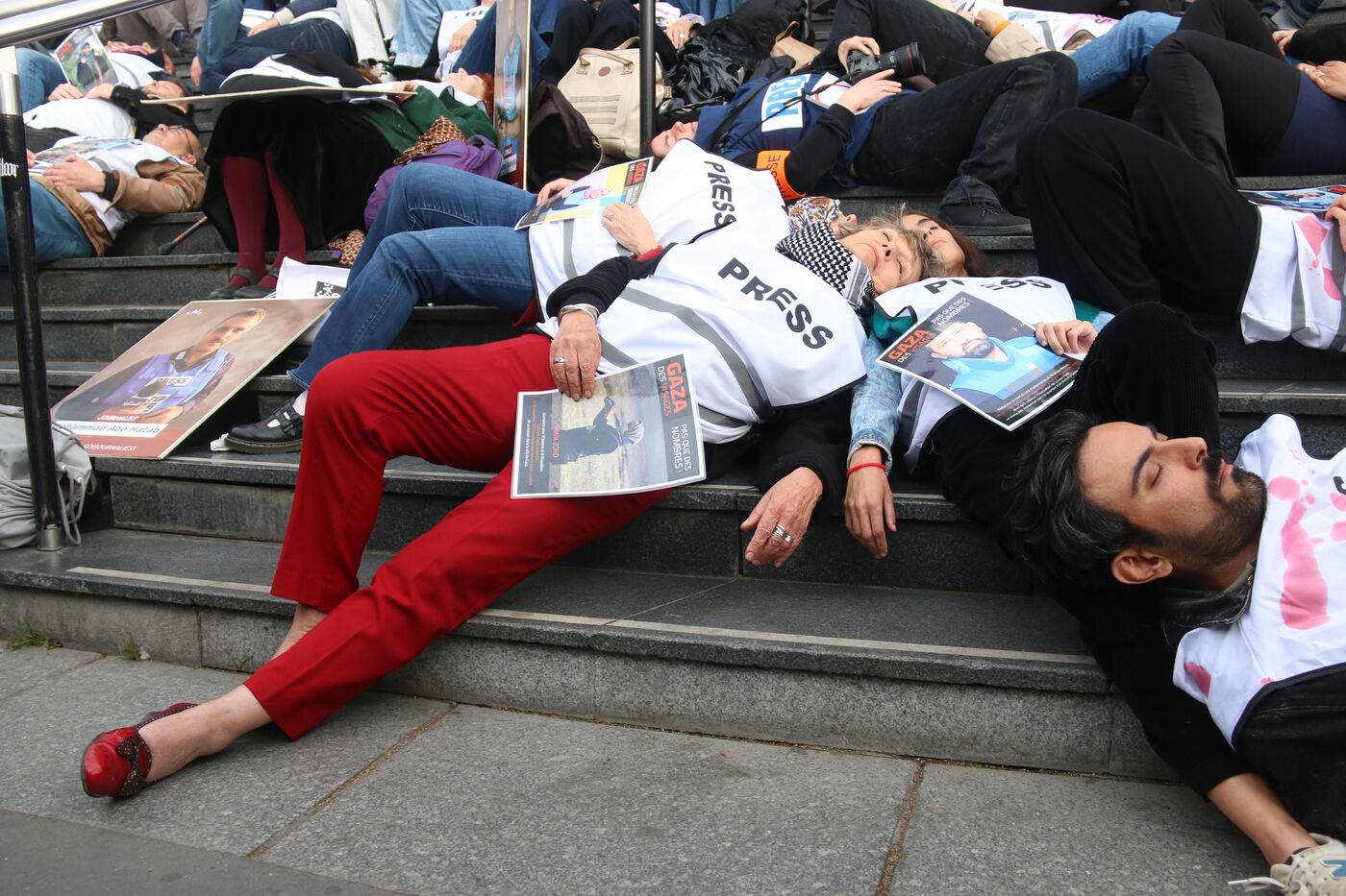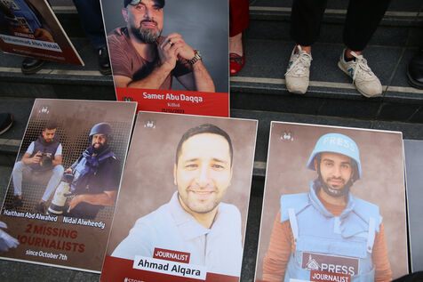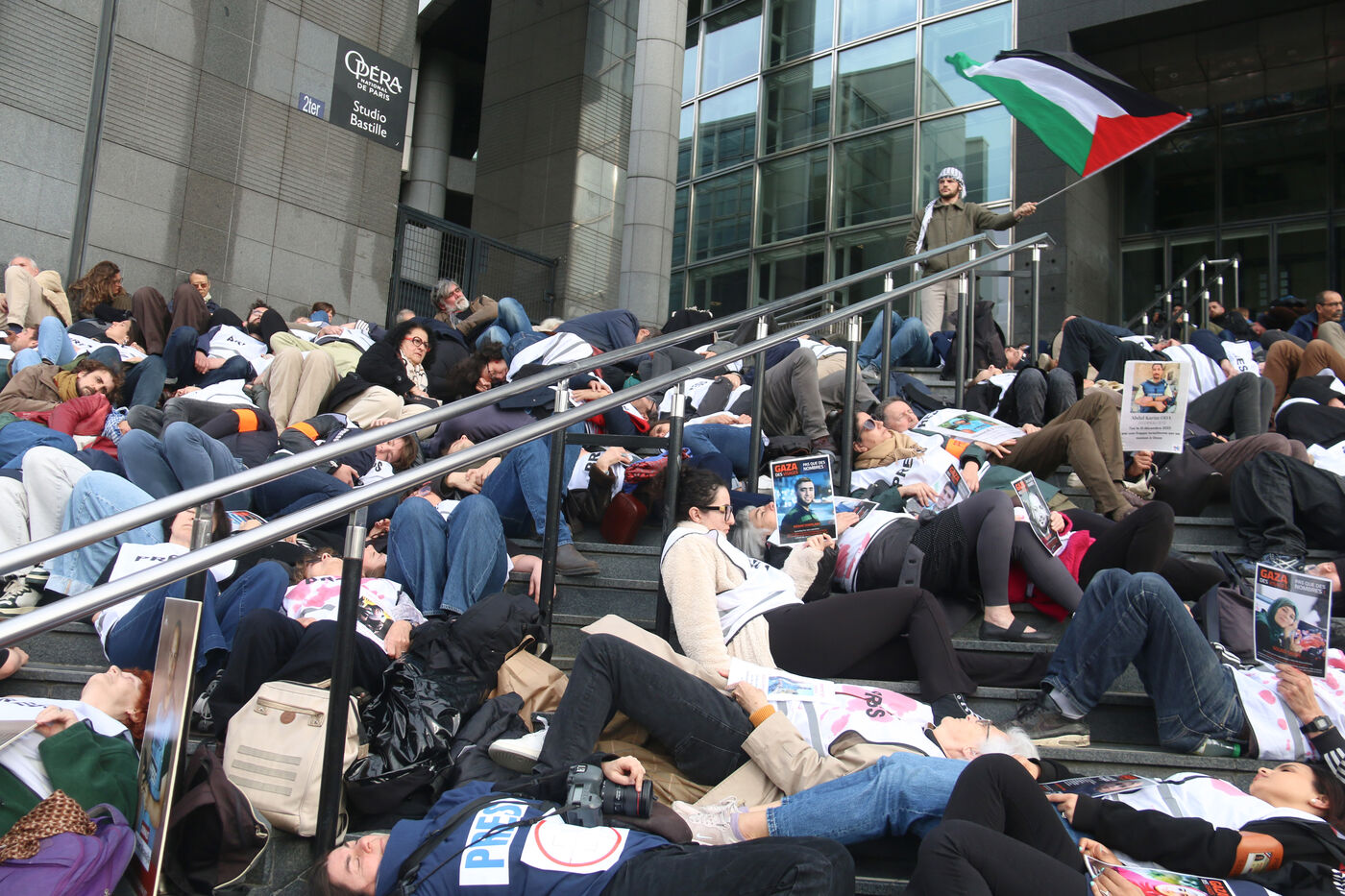 Journalists gathered in solidarity with their Palestinian colleagues killed in Gaza during the Israeli-Palestinian conflict in front of the Bastille Opera in Paris on April 16, 2025.