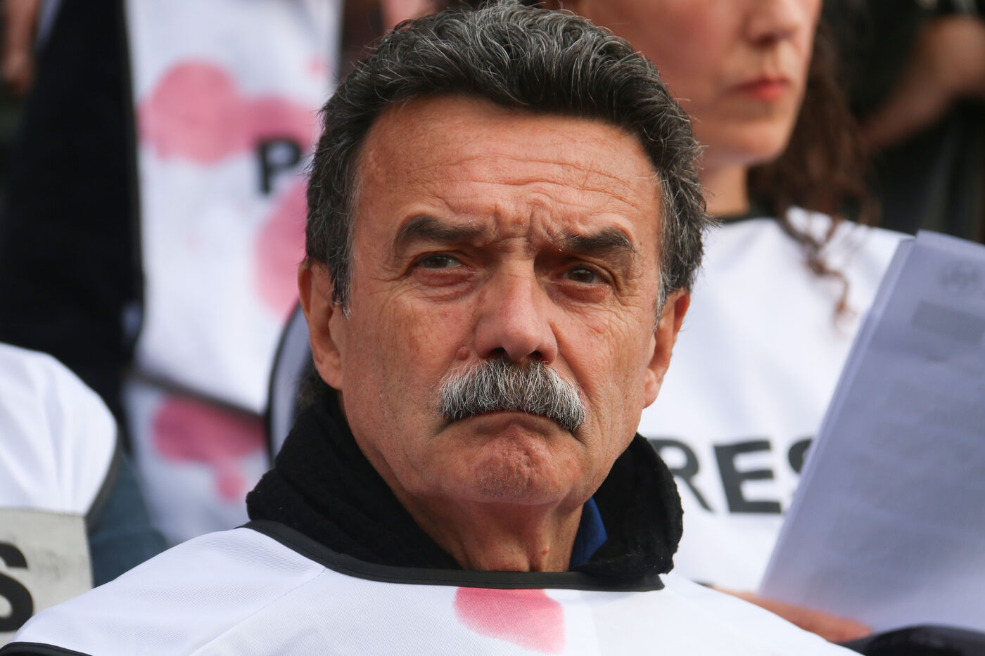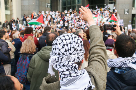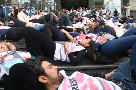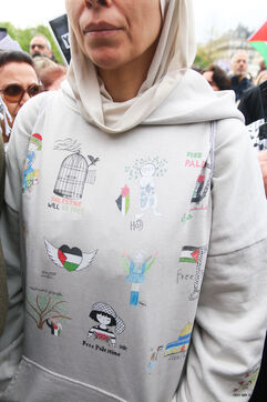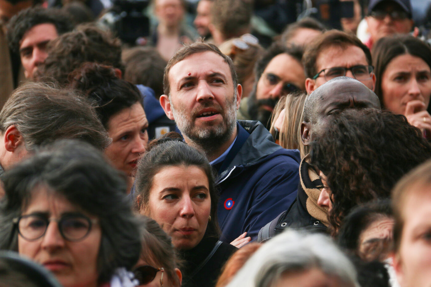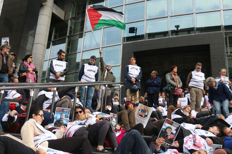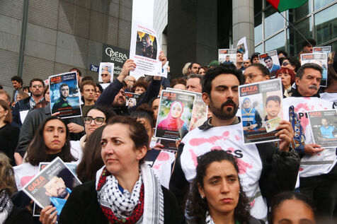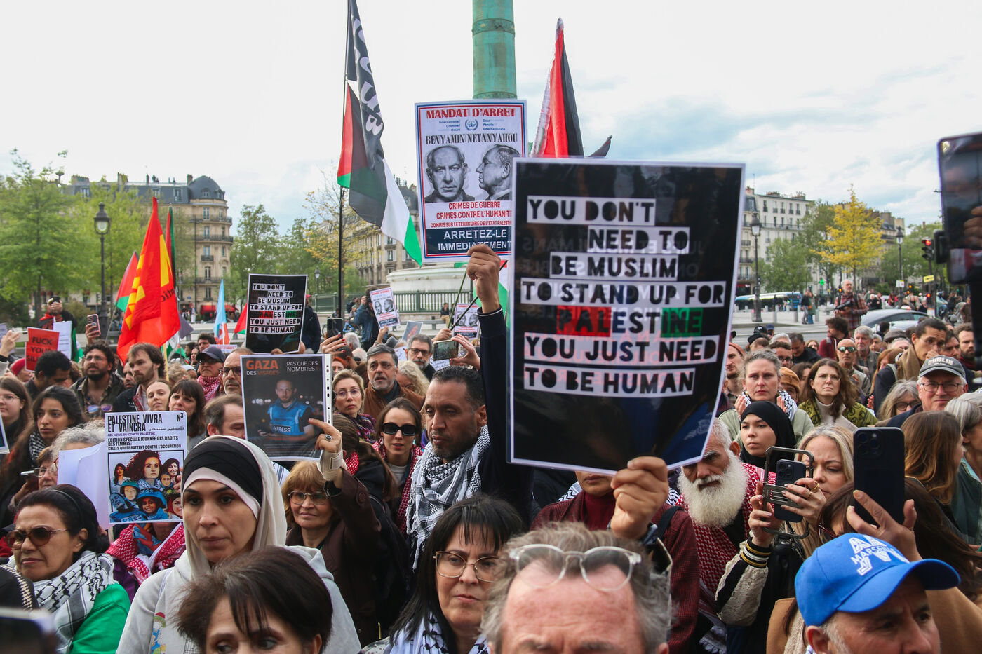 Journalists gathered in solidarity with their Palestinian colleagues killed in Gaza during the Israeli-Palestinian conflict in front of the Bastille Opera in Paris on April 16, 2025.