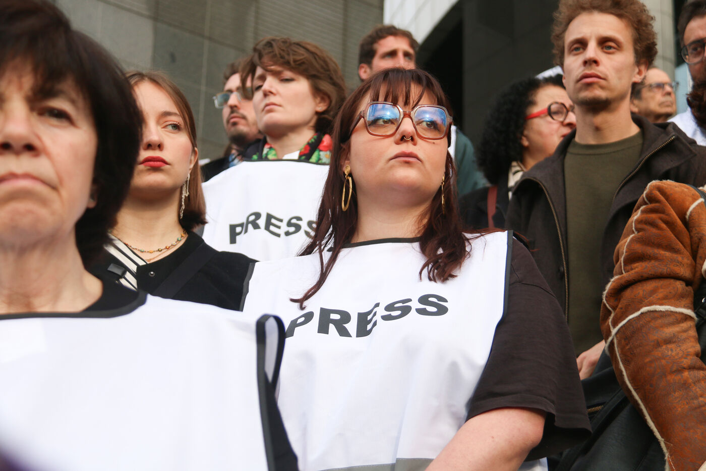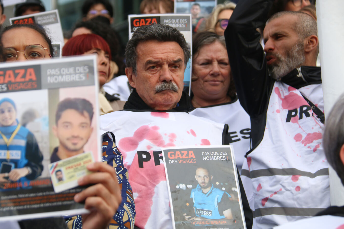Les journalistes se sont rassembles en solidarité avec leur collègues palestiniens tues a Gaza lors du conflit israélo-palestinien devant l Opéra Bastille a Paris le 16 avril 2025.