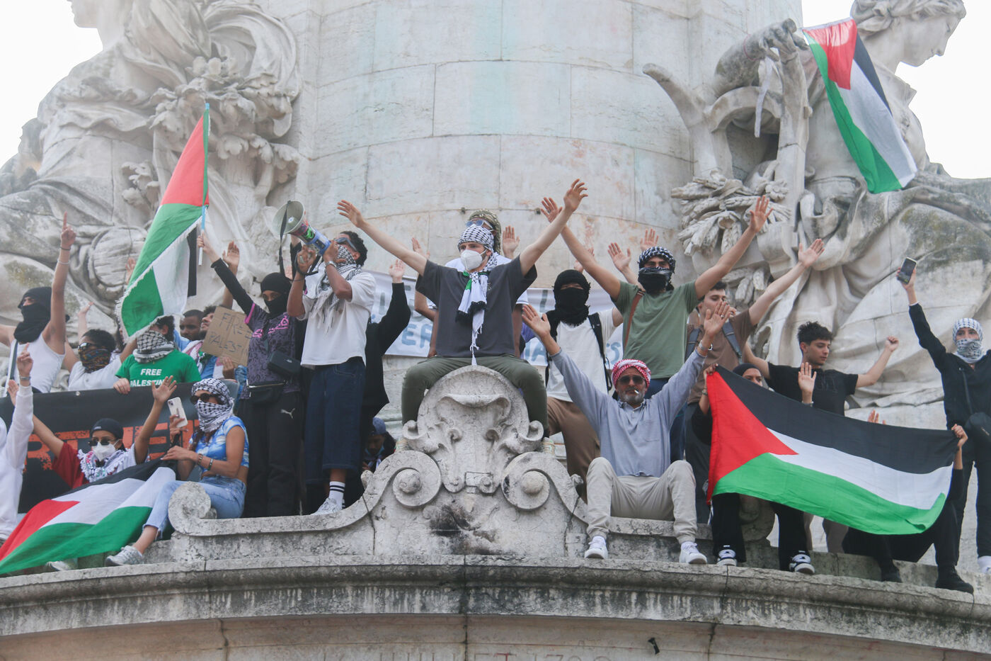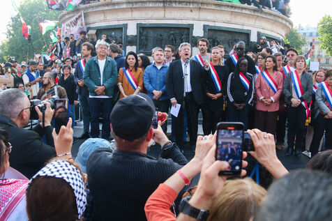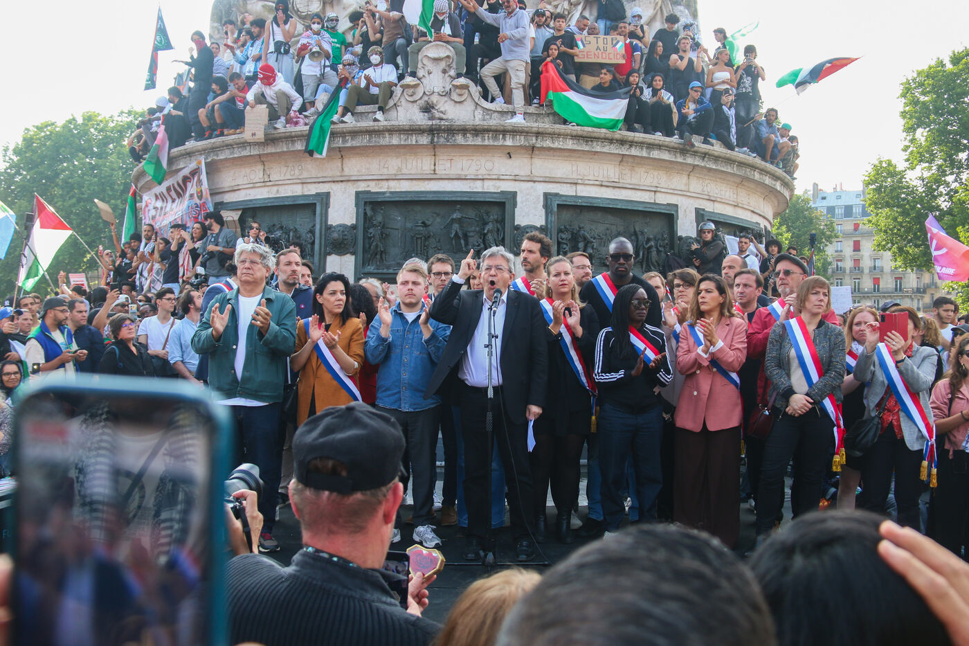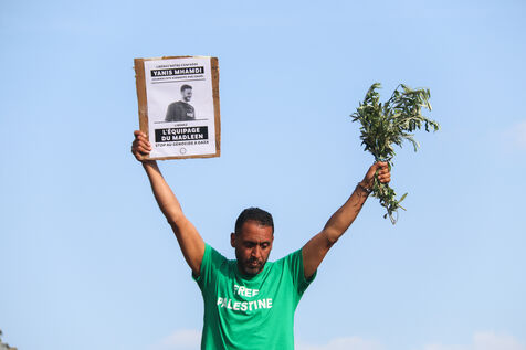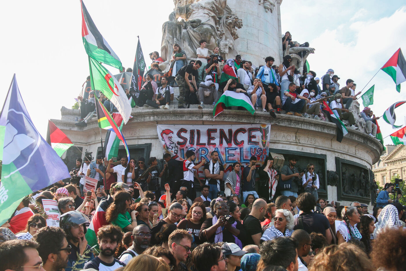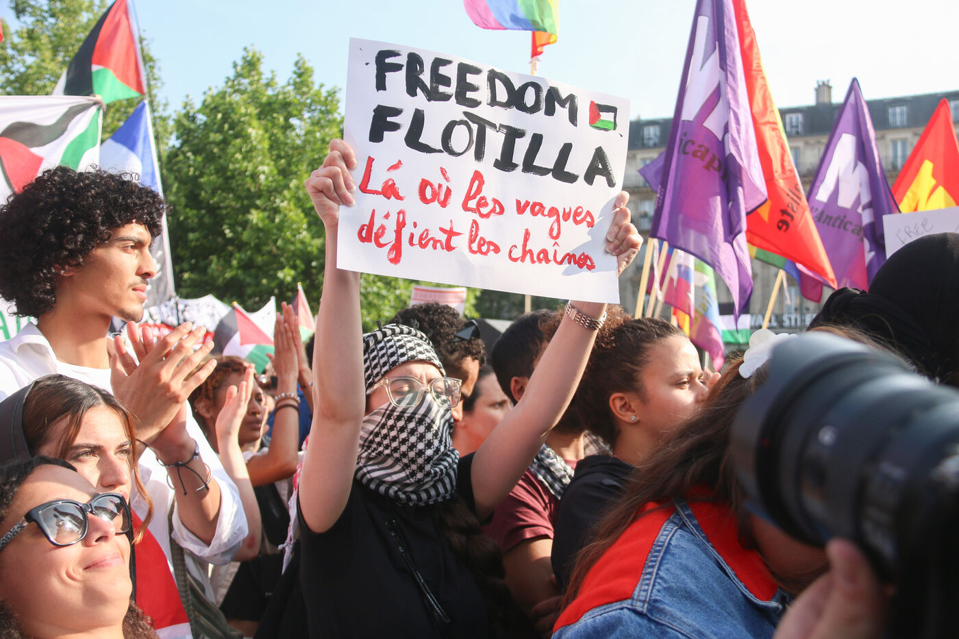 Thousands of people attended the rally organized by La France Insoumise (LFI) at Place de la Republique to demand the release of Rima Hassan and Greta Thumberg following the interception of the humanitarian sailing ship Gaza Freedom Flotilla by Israeli authorities. Paris, June 9, 2025.