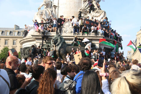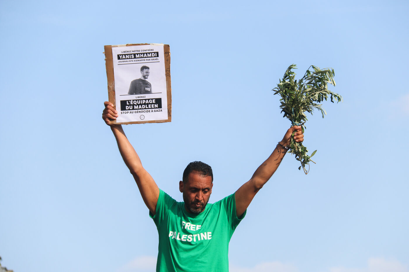 Des milliers de personnes sont venues lors du rassemblement organisé par La France Insoumise (LFI) à Place de la République pour réclamer la libération de Rima Hassan et Greta Thumberg suite à l'interception du voilier humanitaire Gaza Freedom Flotilla par les autorités israéliennes. Paris, 9 juin 2025.