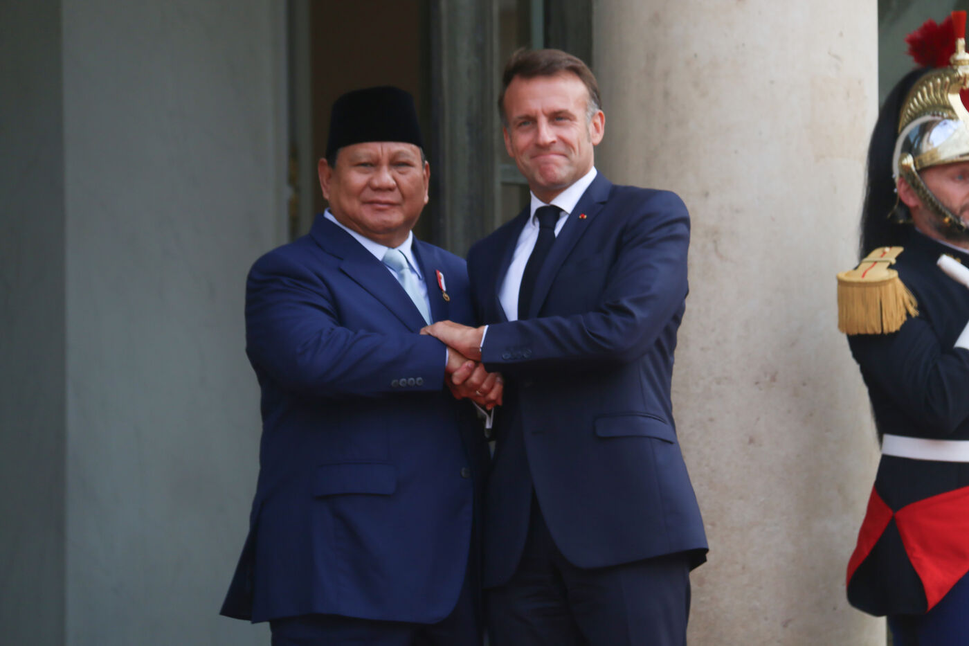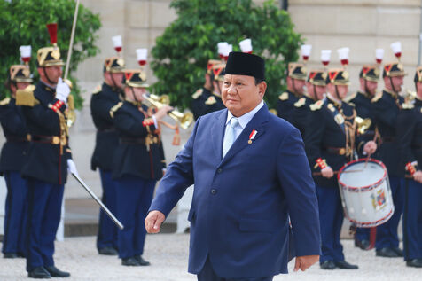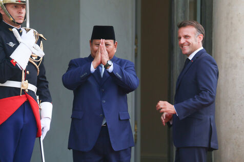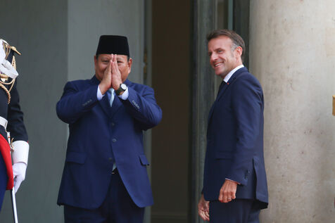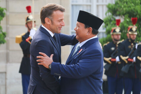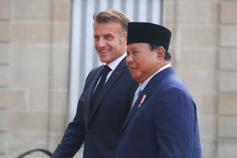 French President Emmanuel Macron receiving Indonesian President Prabowo Subianto for a working dinner at the Elysée Palace in Paris on July 14, 2025.