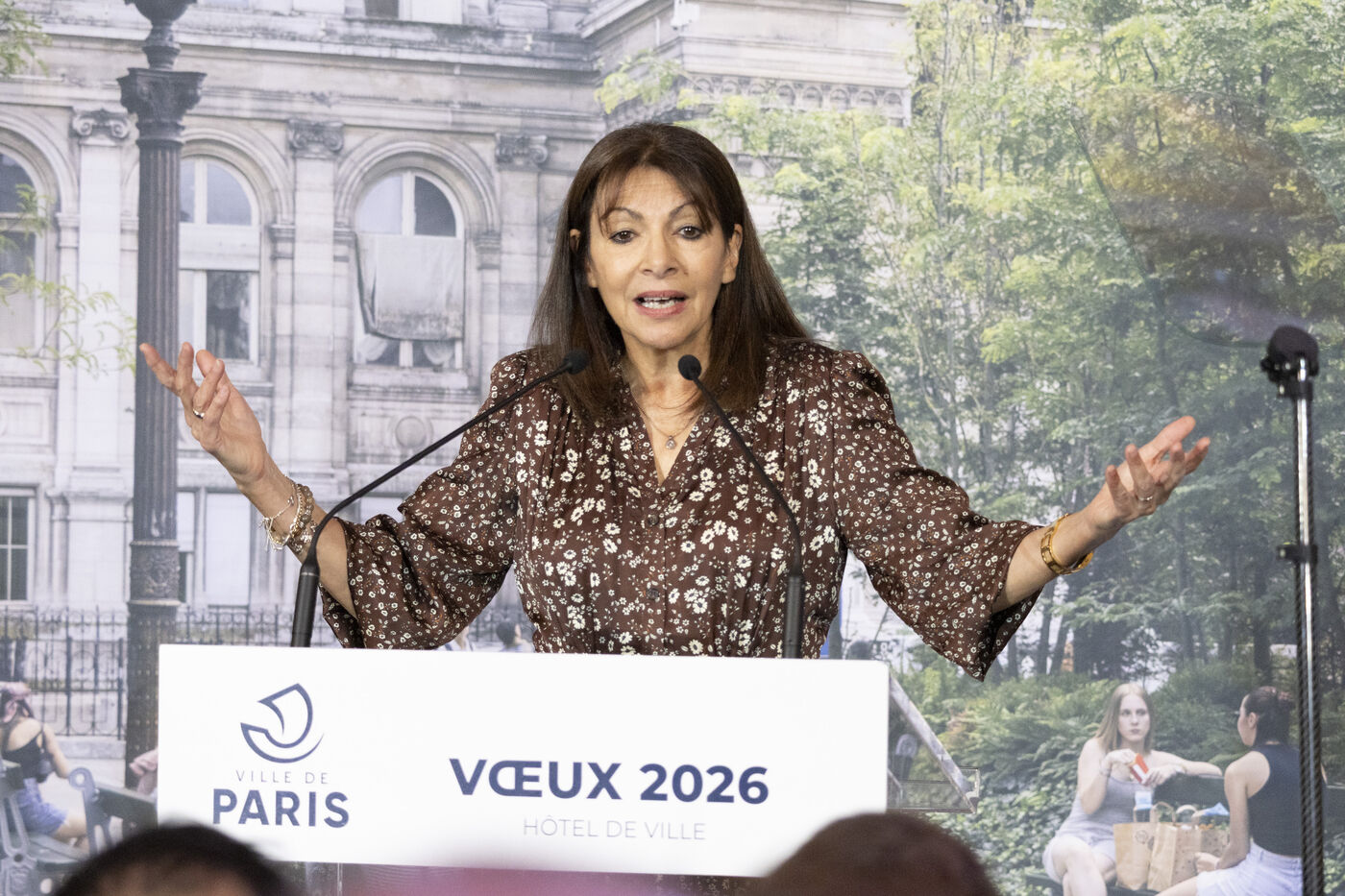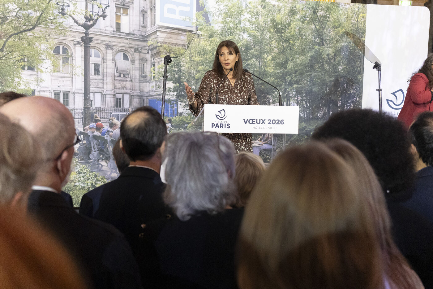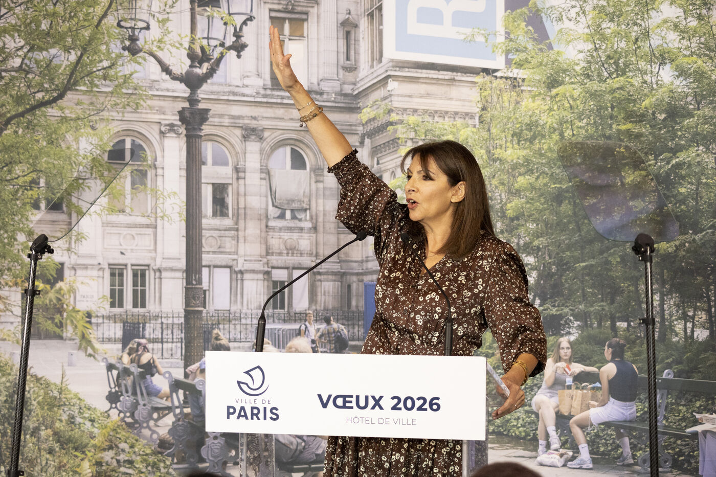 La Maire de Paris Anne Hidalgo adresse ses vœux pour la dernière fois à l'issue de ses deux mandats à la Mairie de Paris avant les élections législatives à l'Hôtel de Ville à paris en France le 14 janvier 2026.