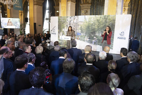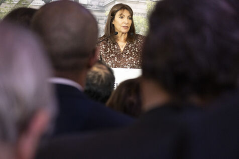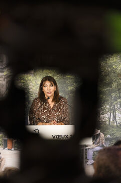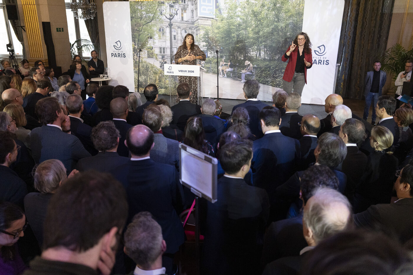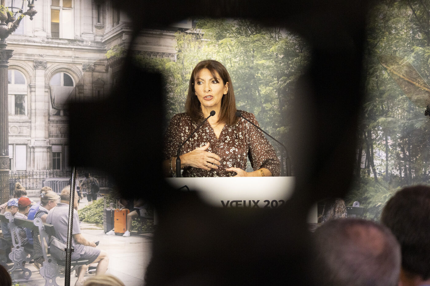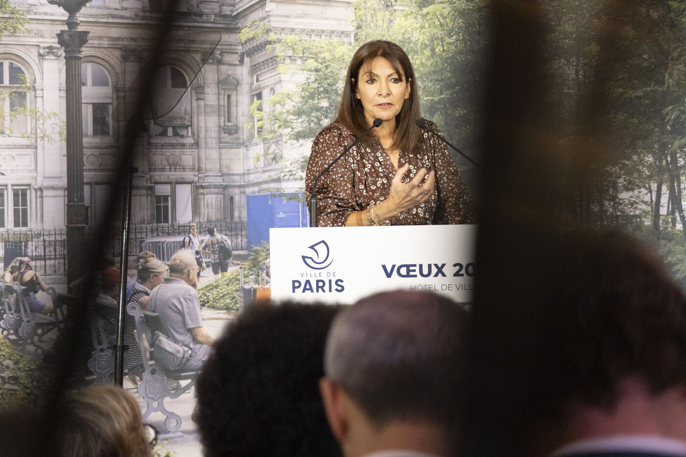 La Maire de Paris Anne Hidalgo adresse ses vœux pour la dernière fois à l'issue de ses deux mandats à la Mairie de Paris avant les élections législatives à l'Hôtel de Ville à paris en France le 14 janvier 2026.