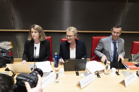 Sophie Le Gall, editor-in-chief of Cash Investigation magazine, Elise Lucet, journalist and presenter of Cash Investigation and Envoye Special programs, and Gilles Delbos, editor-in-chief of Envoye Special, during a hearing before the public broadcasting inquiry committee at the National Assembly in Paris, France, on February 10, 2026.