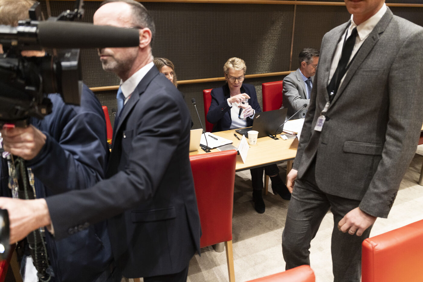 La rédactrice en chef du magazine Cash Investigation Sophie Le Gall, la journaliste et présentatrice des émissions Cash Investigation et Envoyé Spécial Elise Lucet et le rédacteur en chef de l’émission Envoyé Spécial Gilles Delbos en audition devant la commission d enquête sur l audiovisuel public a l'Assemblée Nationale à Paris en France le 10 février 2026.