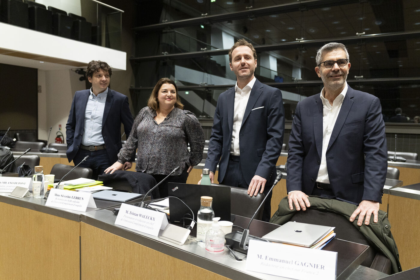 Le journaliste et grand reporter (Complément d'enquête) Louis Minalo-Dupont, la rédactrice en chef adjointe de l'émission Complément d'enquête Séverine Lebrun, le présentateur et rédacteur en chef de l'émission Complément d'enquête Tristan Waleckx et le rédacteur en chef de France 2 en charge de la collection La guerre de l'info Emmanuel Gagnier lors d'une audition devant la Commission d'enquête sur la neutralité, le fonctionnement et le financement de l'audiovisuel public à l'Assemblée nationale à Paris, France, le 12 février 2026.