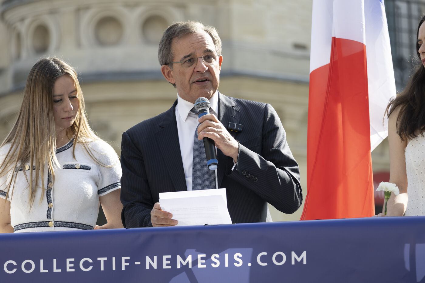 Le Collectif Nemesis s'est rassemblé dans le 16eme arrondissement de Paris pour la Journée Internationale du Droit des Femmes à Paris en France le 8 mars 2026.