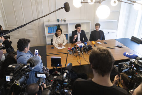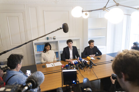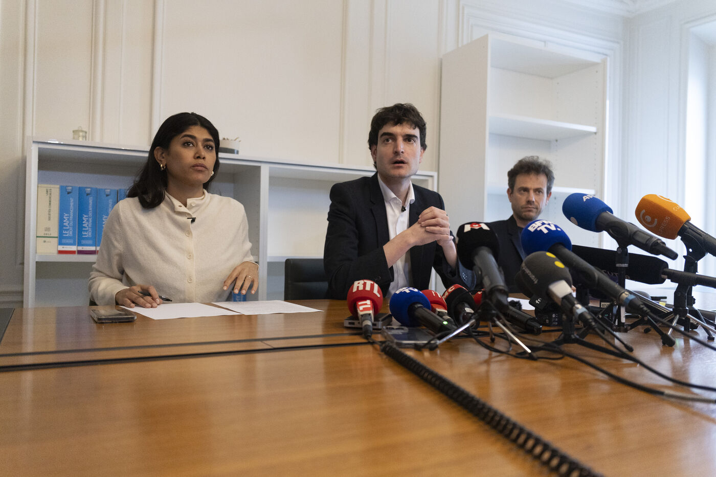 La députée européene de La France Insoumise LFI Rima Hassan, son avocat Vincent Brengarth et le députe La France Insoumise - Nouveau front Polulaire ( LFI-NFP) Paul Vannier lors de la conférence de presse à l'issue de l'audition de Rima Hassan au siège régional de la Police Judiciaire de Paris a Paris en France le 3 avril 2026.