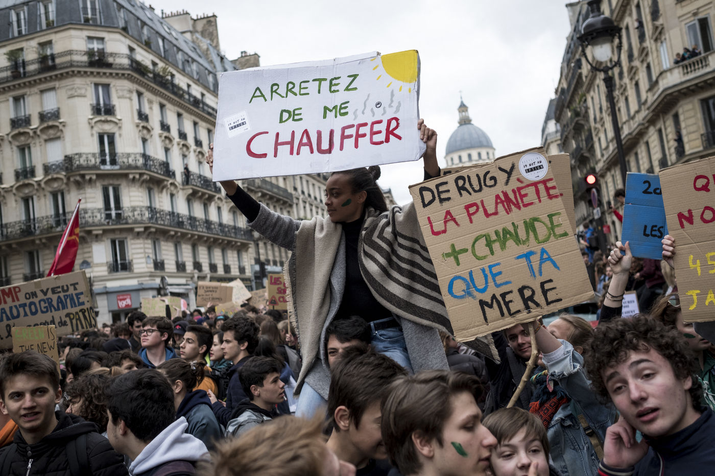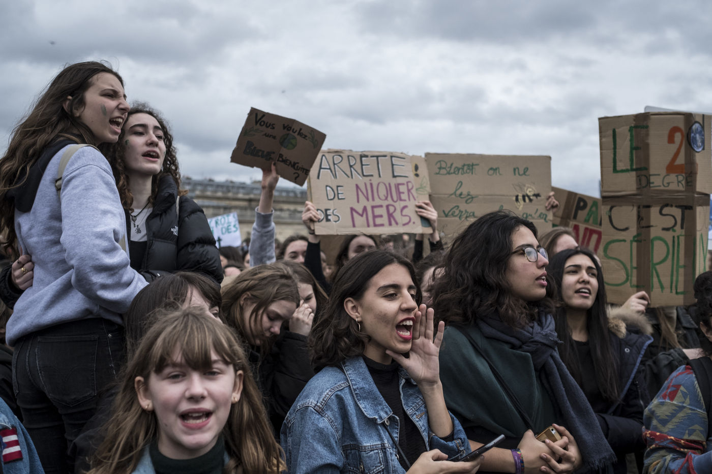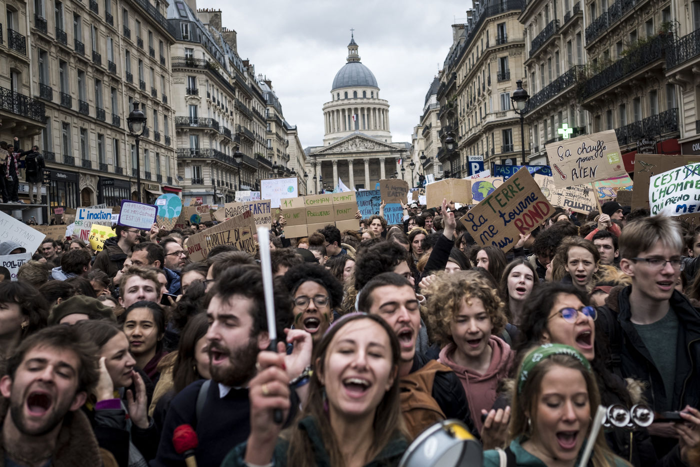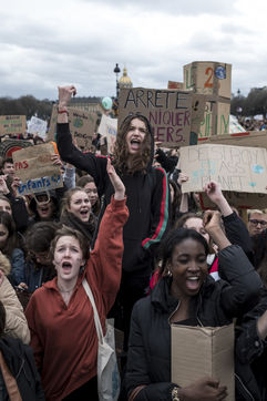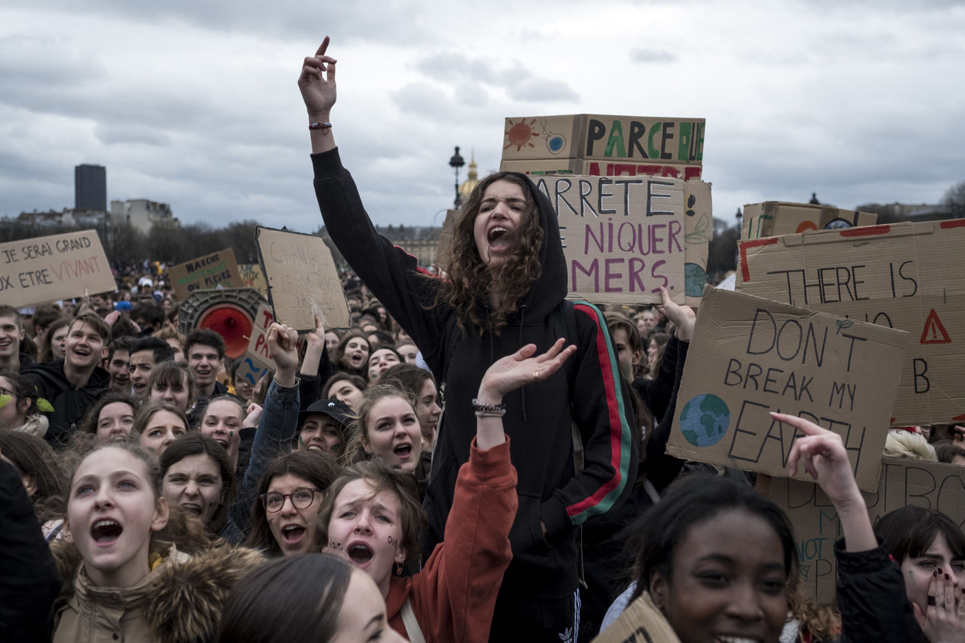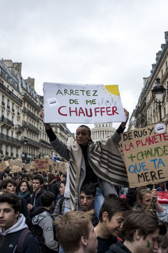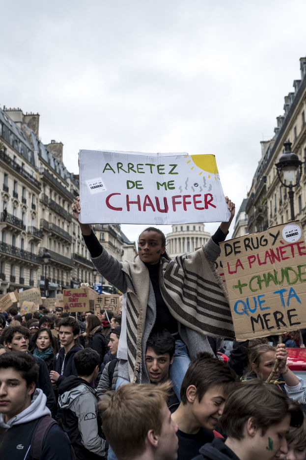 Paris, le 15 mars 2019. Plusieurs dizaines de milliers de jeunes, lycéens, étudiants, ainsi que des militants ecologistes ont manifesté à Paris entre le Panthéon et l'esplanade des Invalides, dans le cadre de la journée de "grève mondiale pour le climat", initié notamment par la jeune militante suédoise Greta Thunberg.