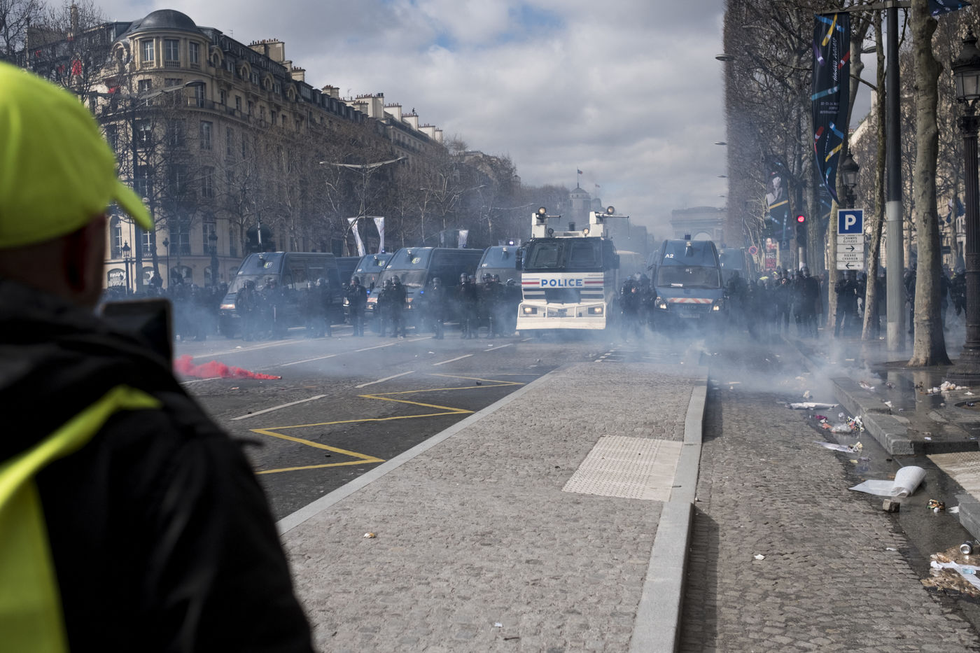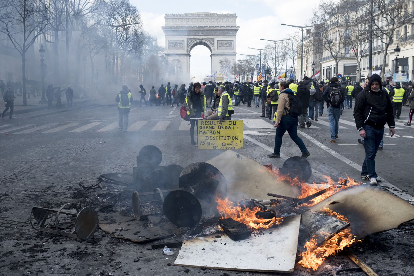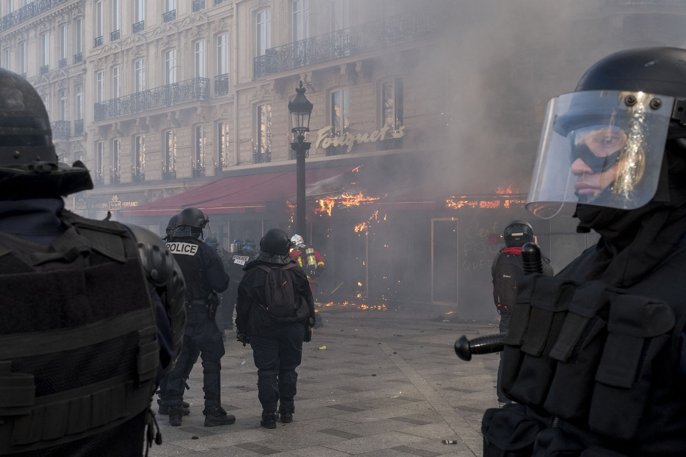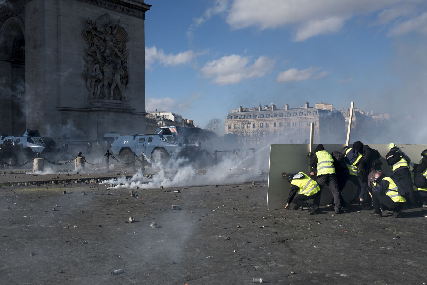Paris, le 16 mars 2019. Pour les quatre mois du mouvement des Gilets Jaunes, et au lendemain de la fin du Grand Débat national voulu par le Président Macron, environ dix mille manifestants se sont retrouvés sur les Champs-Elysées et la Place de l'Etoile. Des affrontements ont rapidement éclaté au pied de l'Arc de Triomphe entre les forces de l'ordre et certains manifestants, dont des "Black Blocks", et ont duré jusqu'en fin de journée. De nombreuses boutiques et restaurants, dont le Fouquets, ont été vandalisés ou incendiés.